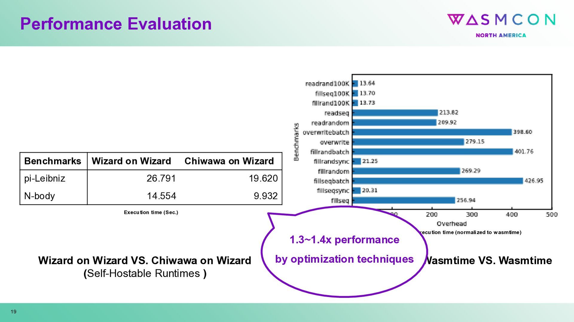 to wasmtime) Performance Evaluation Wizard on Wizard VS. Chiwawa on Wizard (Self-Hostable Runtimes ) 1.3~1.4x performance by optimization techniques Benchmarks Wizard on Wizard Chiwawa on Wizard pi-Leibniz 26.791 19.620 N-body 14.554 9.932 Execution time (Sec.)