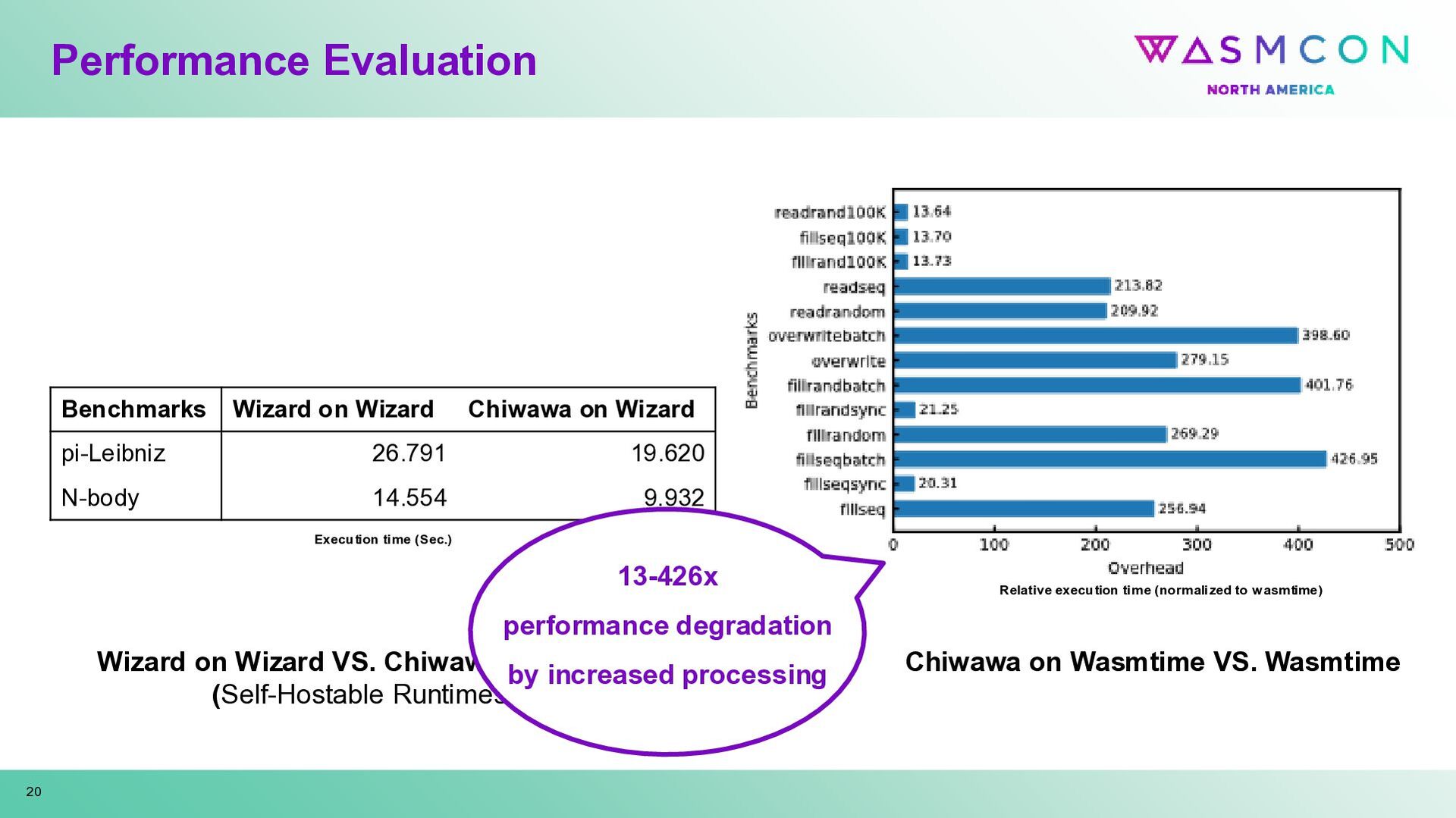 ) Benchmarks Wizard on Wizard Chiwawa on Wizard pi-Leibniz 26.791 19.620 N-body 14.554 9.932 Performance Evaluation Chiwawa on Wasmtime VS. Wasmtime 13-426x performance degradation by increased processing Relative execution time (normalized to wasmtime) Execution time (Sec.)