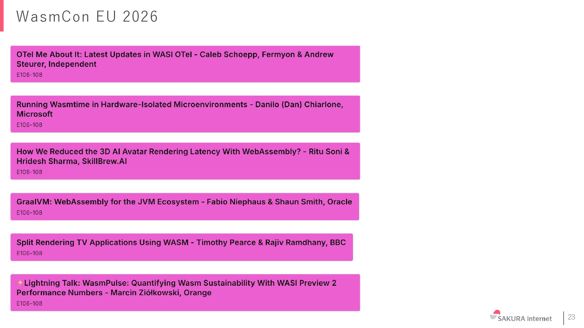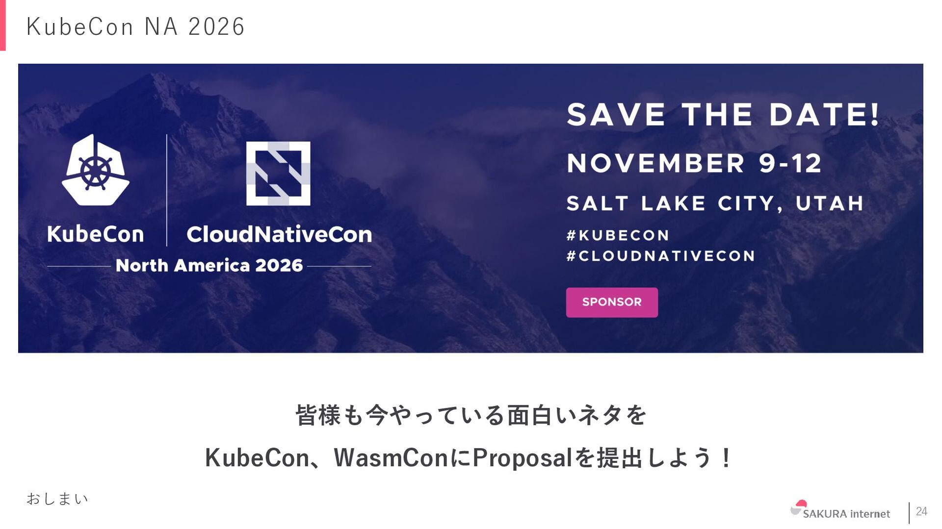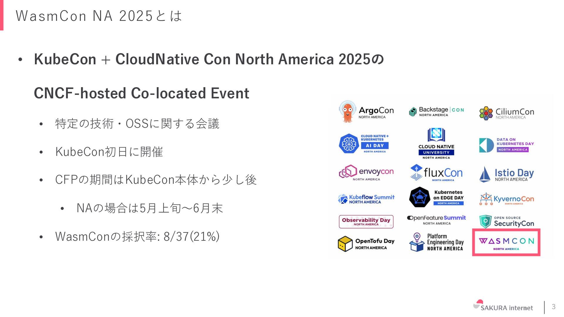 America 2025の CNCF-hosted Co-located Event • 特定の技術・OSSに関する会議 • KubeCon初日に開催 • CFPの期間はKubeCon本体から少し後 • NAの場合は5月上旬〜6月末 • WasmConの採択率: 8/37(21%)