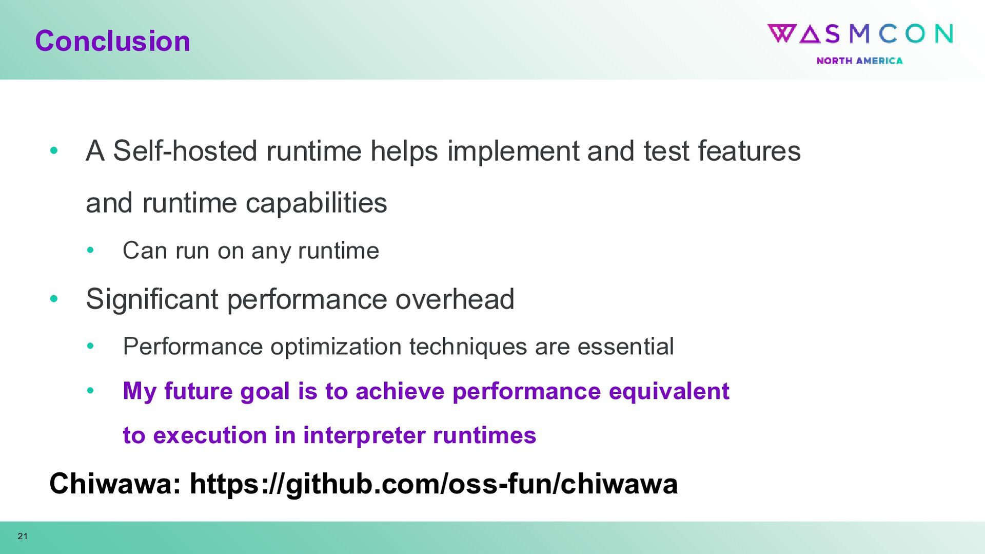 features and runtime capabilities • Can run on any runtime • Significant performance overhead • Performance optimization techniques are essential • My future goal is to achieve performance equivalent to execution in interpreter runtimes Chiwawa: https://github.com/oss-fun/chiwawa