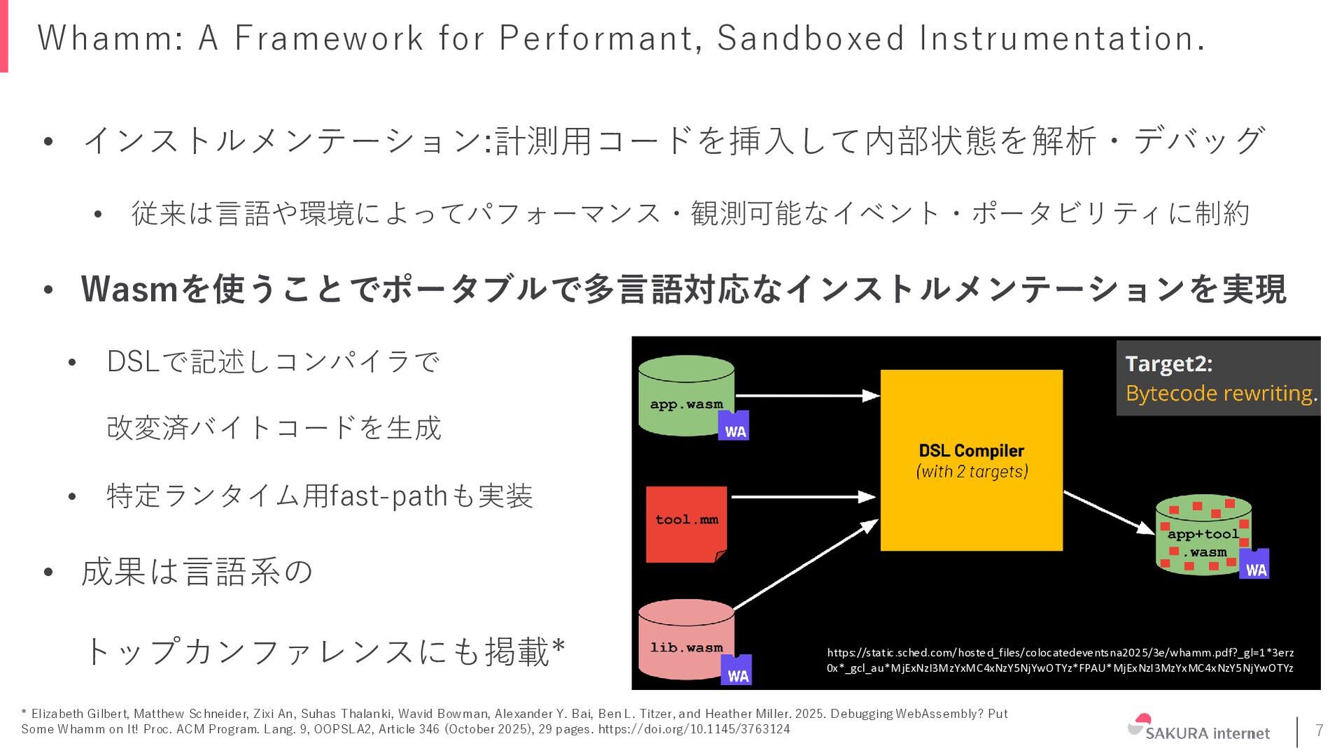 • 従来は言語や環境によってパフォーマンス・観測可能なイベント・ポータビリティに制約 • Wasmを使うことでポータブルで多言語対応なインストルメンテーションを実現 • DSLで記述しコンパイラで 改変済バイトコードを生成 • 特定ランタイム用fast-pathも実装 • 成果は言語系の トップカンファレンスにも掲載* https://static.sched.com/hosted_files/colocatedeventsna2025/3e/whamm.pdf?_gl=1*3erz 0x*_gcl_au*MjExNzI3MzYxMC4xNzY5NjYwOTYz*FPAU*MjExNzI3MzYxMC4xNzY5NjYwOTYz * Elizabeth Gilbert, Matthew Schneider, Zixi An, Suhas Thalanki, Wavid Bowman, Alexander Y. Bai, Ben L. Titzer, and Heather Miller. 2025. Debugging WebAssembly? Put Some Whamm on It! Proc. ACM Program. Lang. 9, OOPSLA2, Article 346 (October 2025), 29 pages. https://doi.org/10.1145/3763124