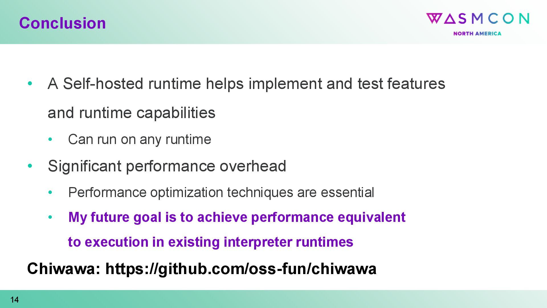 features and runtime capabilities • Can run on any runtime • Significant performance overhead • Performance optimization techniques are essential • My future goal is to achieve performance equivalent to execution in existing interpreter runtimes Chiwawa: https://github.com/oss-fun/chiwawa