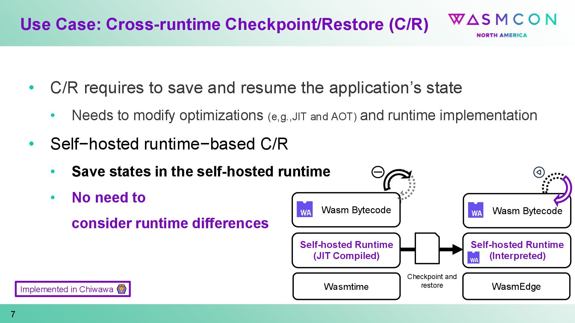 save and resume the application’s state • Needs to modify optimizations (e,g.,JIT and AOT) and runtime implementation • Self−hosted runtime−based C/R • Save states in the self-hosted runtime • No need to consider runtime differences Implemented in Chiwawa Self-hosted Runtime (JIT Compiled) Wasmtime Wasm Bytecode WasmEdge Self-hosted Runtime (Interpreted) Wasm Bytecode Checkpoint and restore