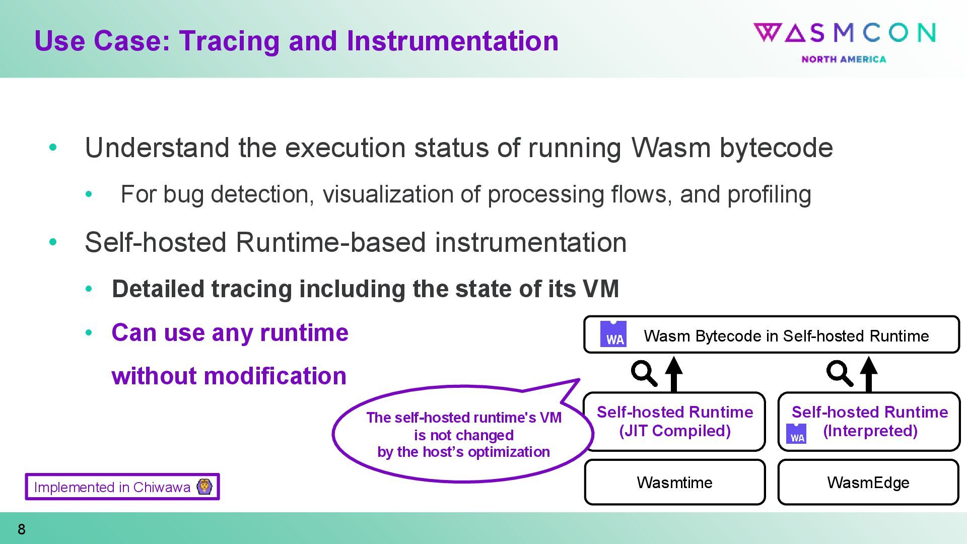 status of running Wasm bytecode • For bug detection, visualization of processing flows, and profiling • Self-hosted Runtime-based instrumentation • Detailed tracing including the state of its VM • Can use any runtime without modification Implemented in Chiwawa Self-hosted Runtime (JIT Compiled) Wasmtime Wasm Bytecode in Self-hosted Runtime WasmEdge Self-hosted Runtime (Interpreted) The self-hosted runtime's VM is not changed by the host’s optimization