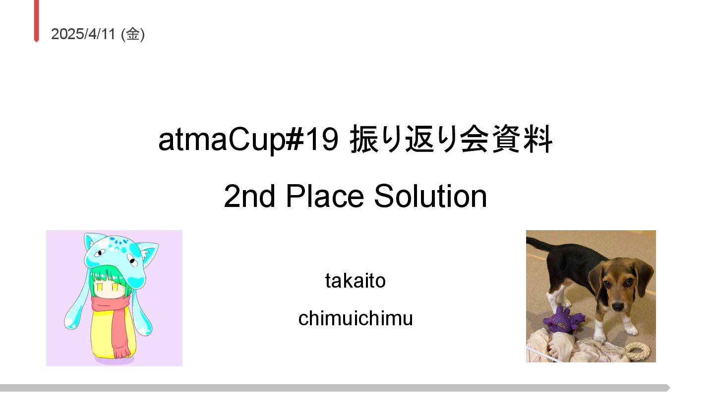 2025/4/11 (金) atmaCup#19 振り返り会資料 2nd Place Solution takaito chimuichimu