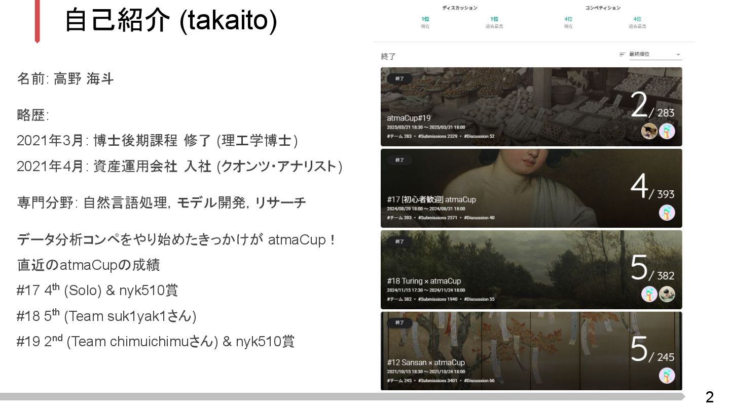 (理工学博士) 2021年4月: 資産運用会社 入社 (クオンツ・アナリスト) 専門分野: 自然言語処理,モデル開発,リサーチ データ分析コンペをやり始めたきっかけが atmaCup! 直近のatmaCupの成績 #17 4th (Solo) & nyk510賞 #18 5th (Team suk1yak1さん) #19 2nd (Team chimuichimuさん) & nyk510賞