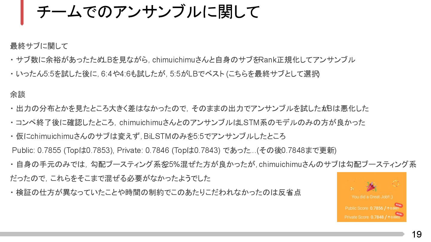 19 チームでのアンサンブルに関して 最終サブに関して ・ サブ数に余裕があったため LBを見ながら,chimuichimuさんと自身のサブをRank正規化してアンサンブル ・ いったん5:5を試した後に,6:4や4:6も試したが,5:5がLBでベスト (こちらを最終サブとして選択 )