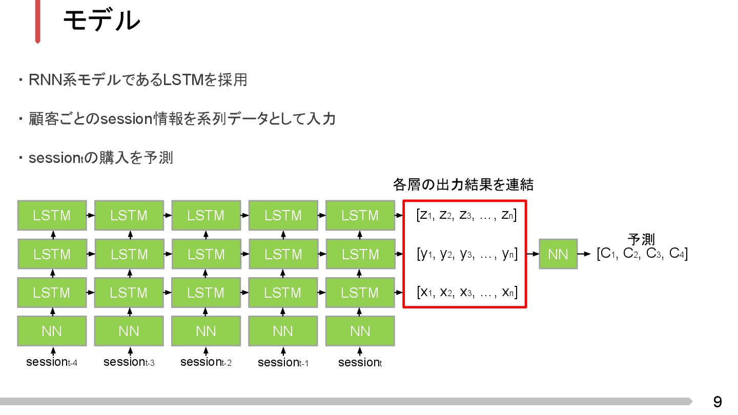 9 モデル ・ RNN系モデルであるLSTMを採用 ・ 顧客ごとのsession情報を系列データとして入力 ・ sessiontの購入を予測 LSTM LSTM