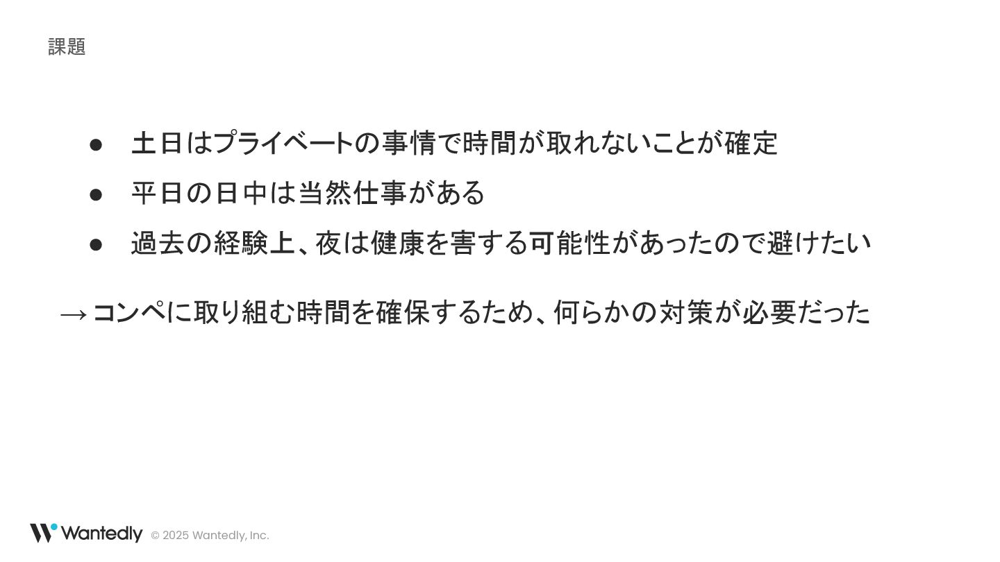 © 2025 Wantedly, Inc. 課題 • 土日はプライベートの事情で時間が取れないことが確定 • 平日の日中は当然仕事がある •