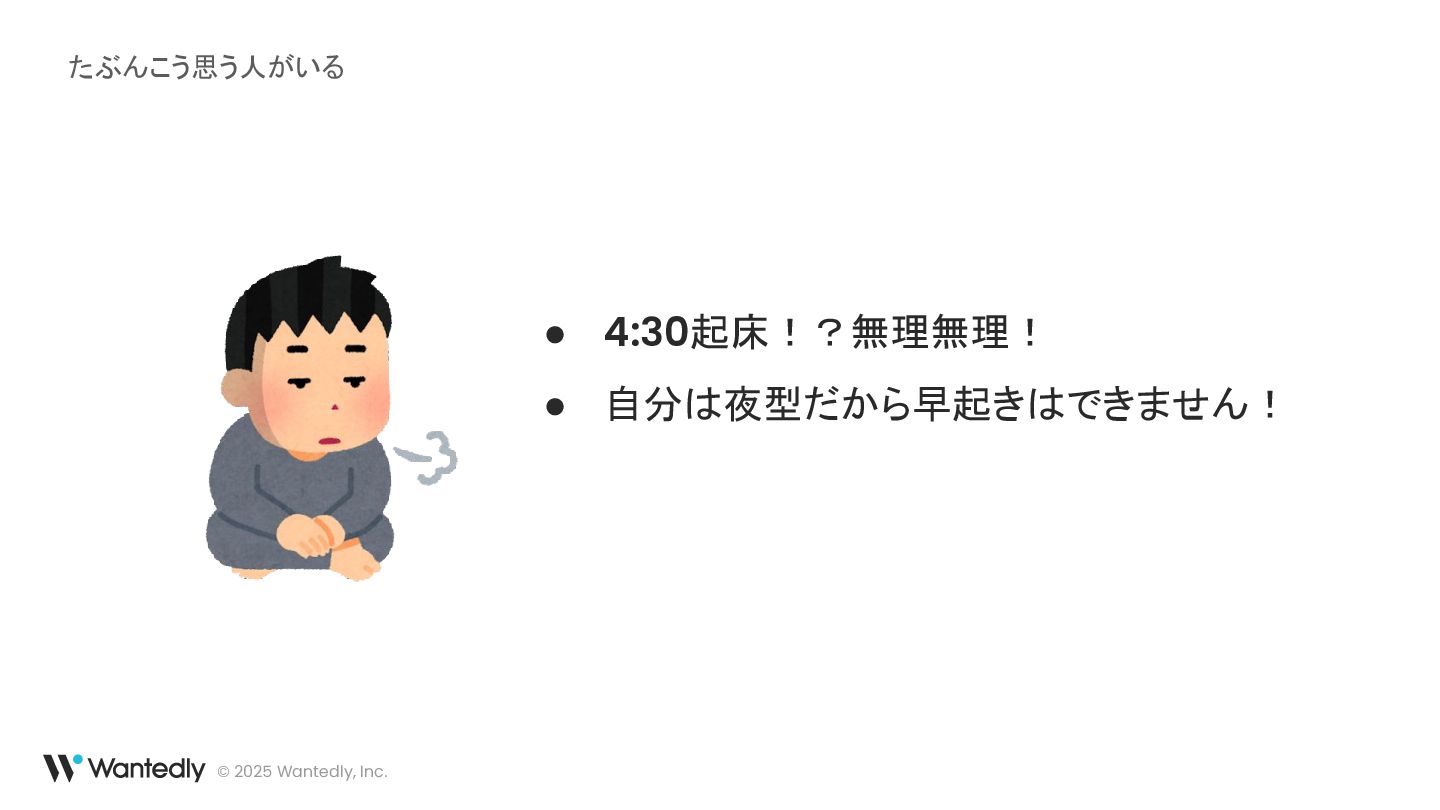 © 2025 Wantedly, Inc. たぶんこう思う人がいる • 4:30起床!?無理無理! • 自分は夜型だから早起きはできません!