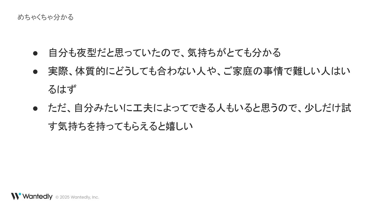 © 2025 Wantedly, Inc. めちゃくちゃ分かる • 自分も夜型だと思っていたので、気持ちがとても分かる • 実際、体質的にどうしても合わない人や、ご家庭の事情で難しい人はい るはず