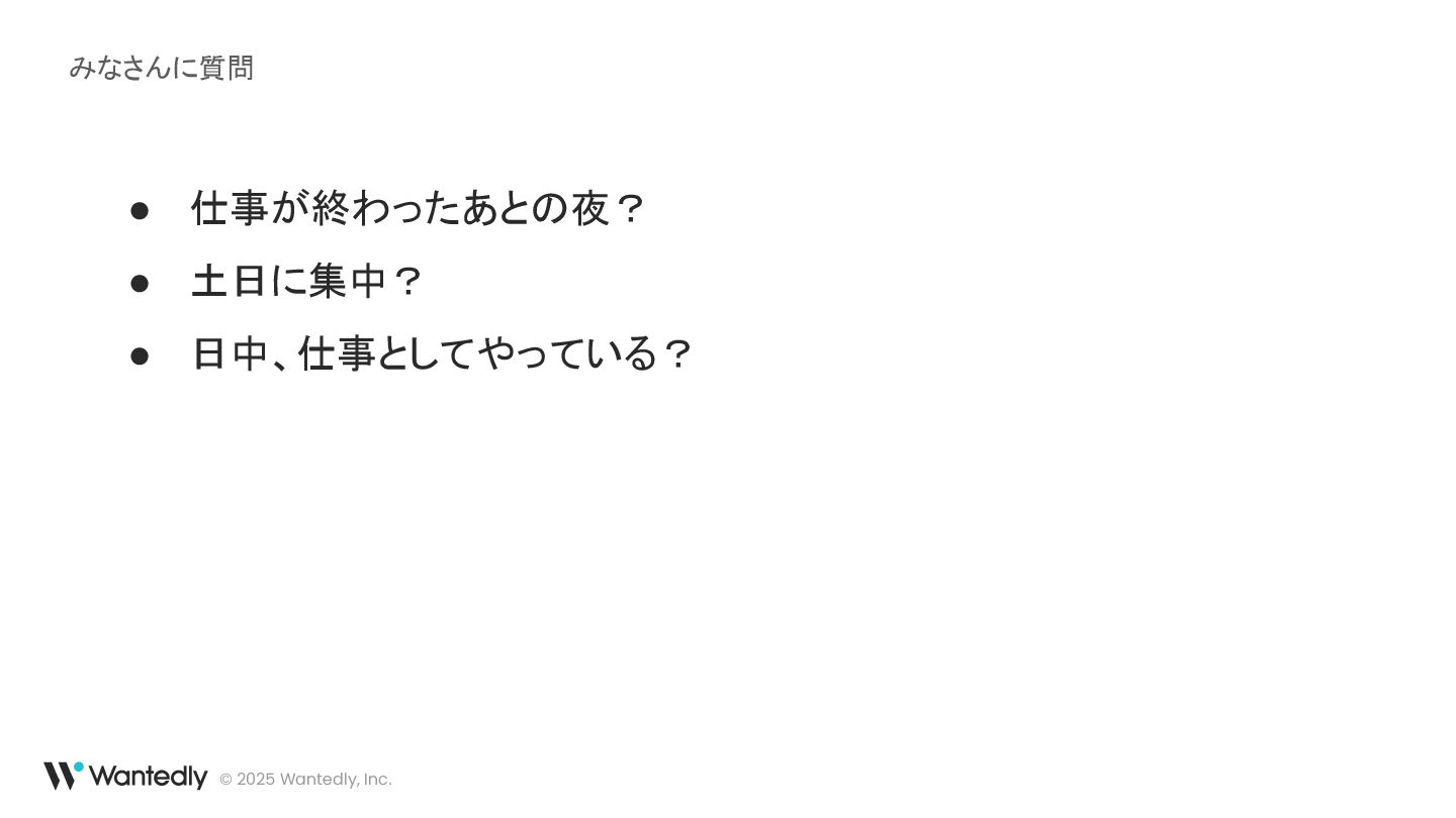 © 2025 Wantedly, Inc. みなさんに質問 • 仕事が終わったあとの夜? • 土日に集中? •