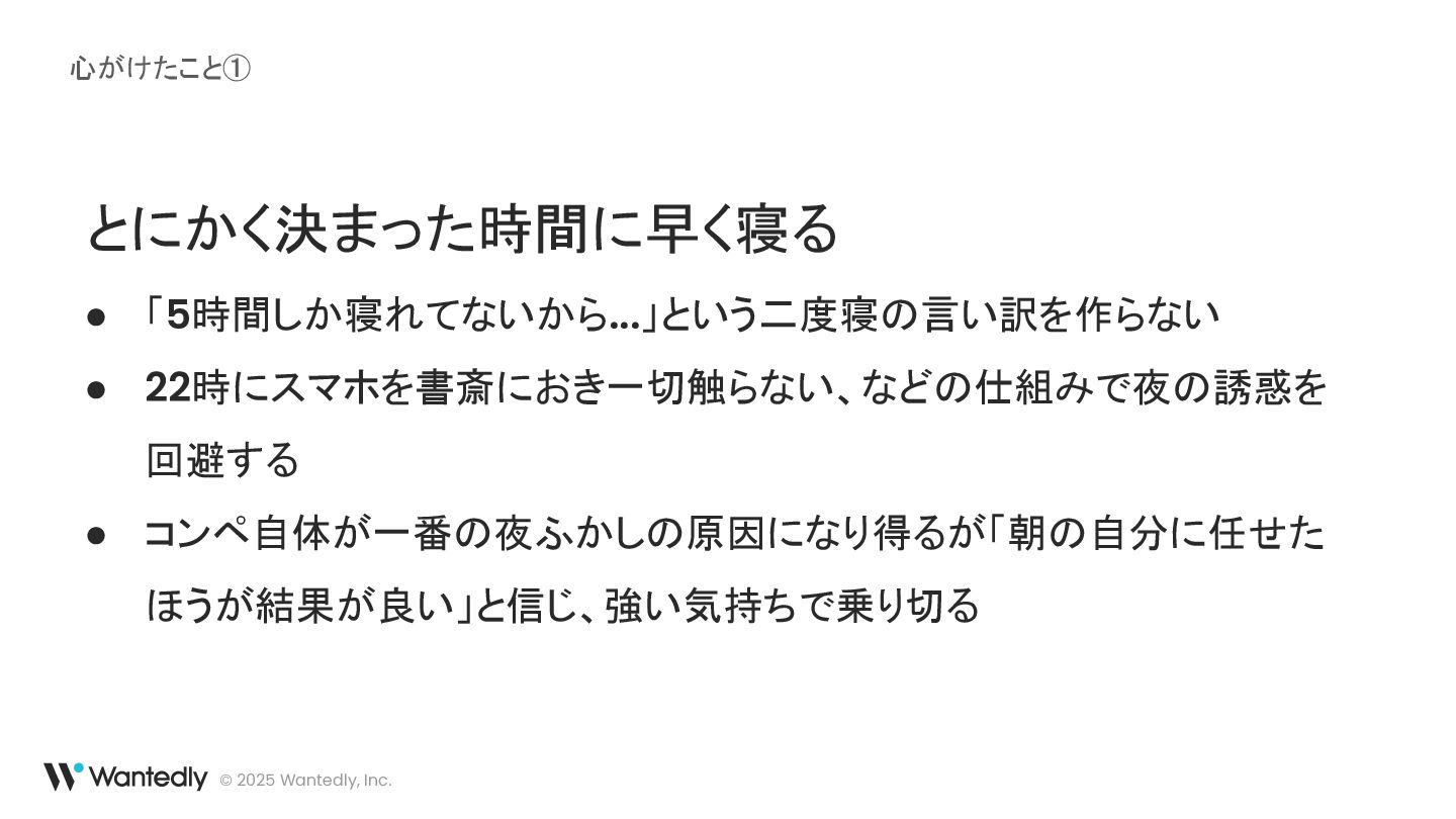 © 2025 Wantedly, Inc. 心がけたこと① • 「5時間しか寝れてないから...」という二度寝の言い訳を作らない • 22時にスマホを書斎におき一切触らない、などの仕組みで夜の誘惑を 回避する
