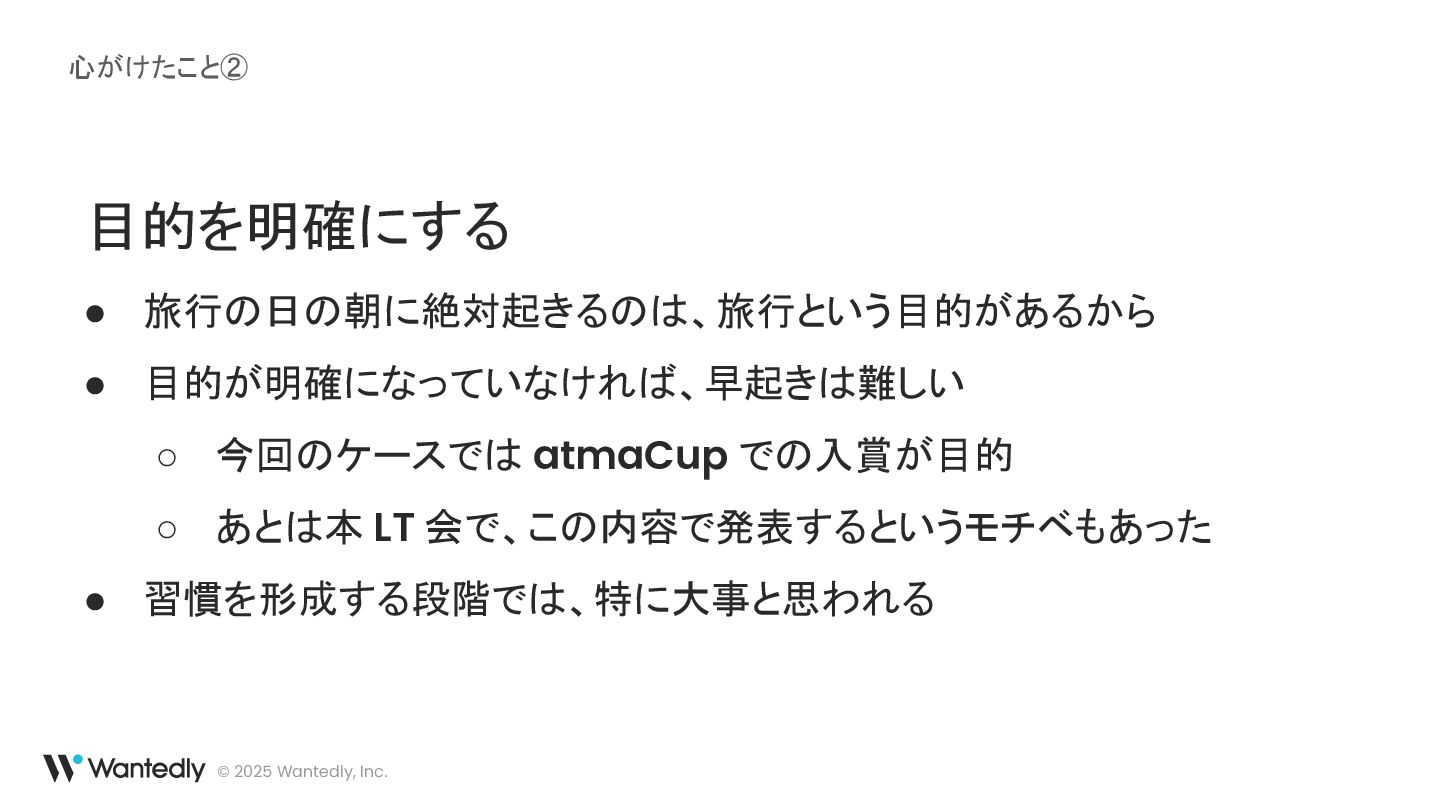 © 2025 Wantedly, Inc. 心がけたこと② • 旅行の日の朝に絶対起きるのは、旅行という目的があるから • 目的が明確になっていなければ、早起きは難しい ◦