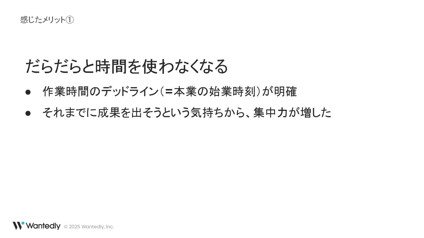 © 2025 Wantedly, Inc. 感じたメリット① • 作業時間のデッドライン(=本業の始業時刻)が明確 • それまでに成果を出そうという気持ちから、集中力が増した だらだらと時間を使わなくなる
