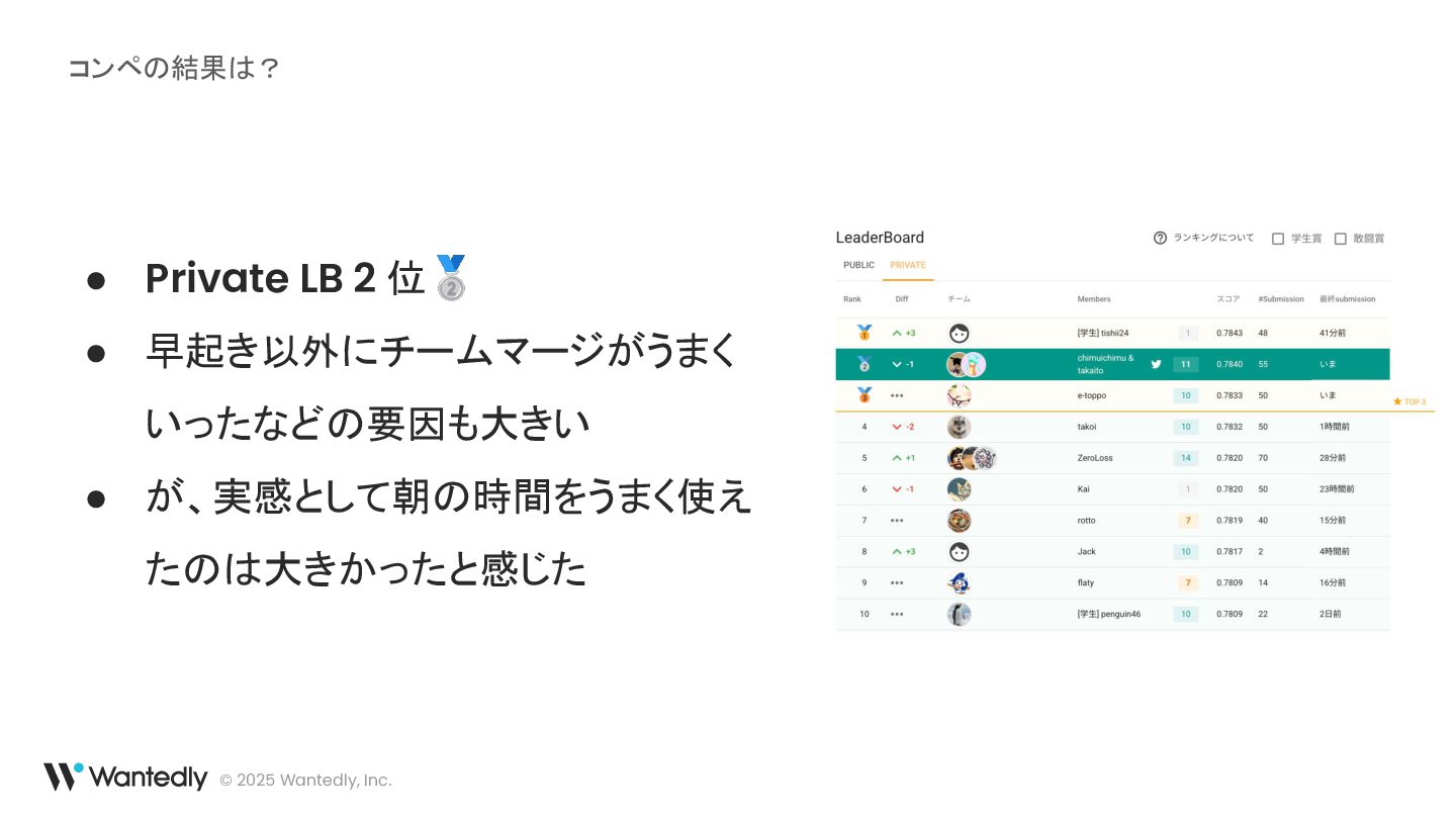 © 2025 Wantedly, Inc. コンペの結果は? • Private LB 2 位🥈