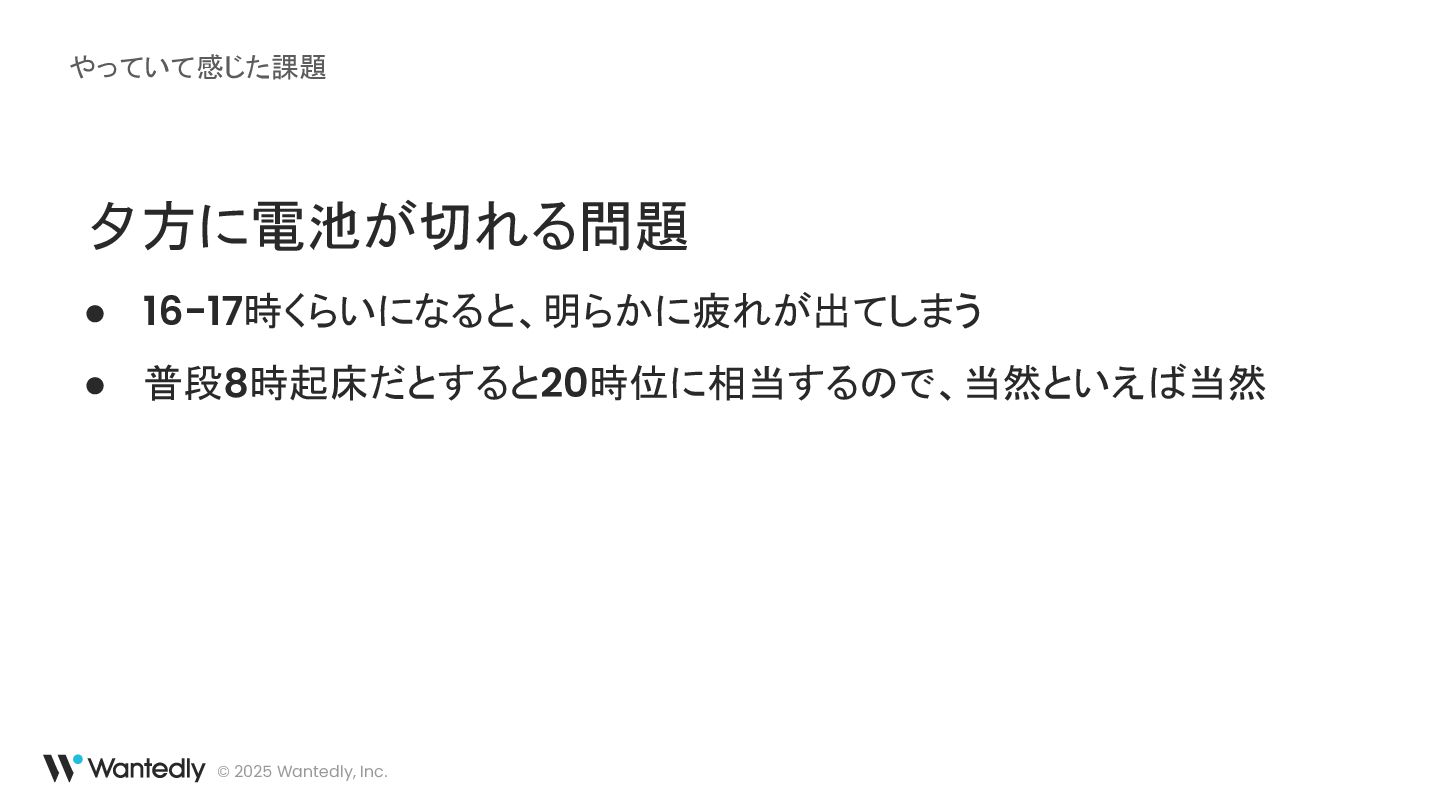 © 2025 Wantedly, Inc. やっていて感じた課題 • 16-17時くらいになると、明らかに疲れが出てしまう • 普段8時起床だとすると20時位に相当するので、当然といえば当然 夕方に電池が切れる問題