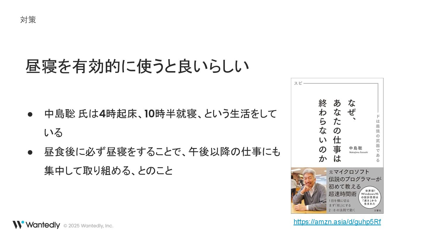 © 2025 Wantedly, Inc. 対策 昼寝を有効的に使うと良いらしい • 中島聡 氏は4時起床、10時半就寝、という生活をして いる