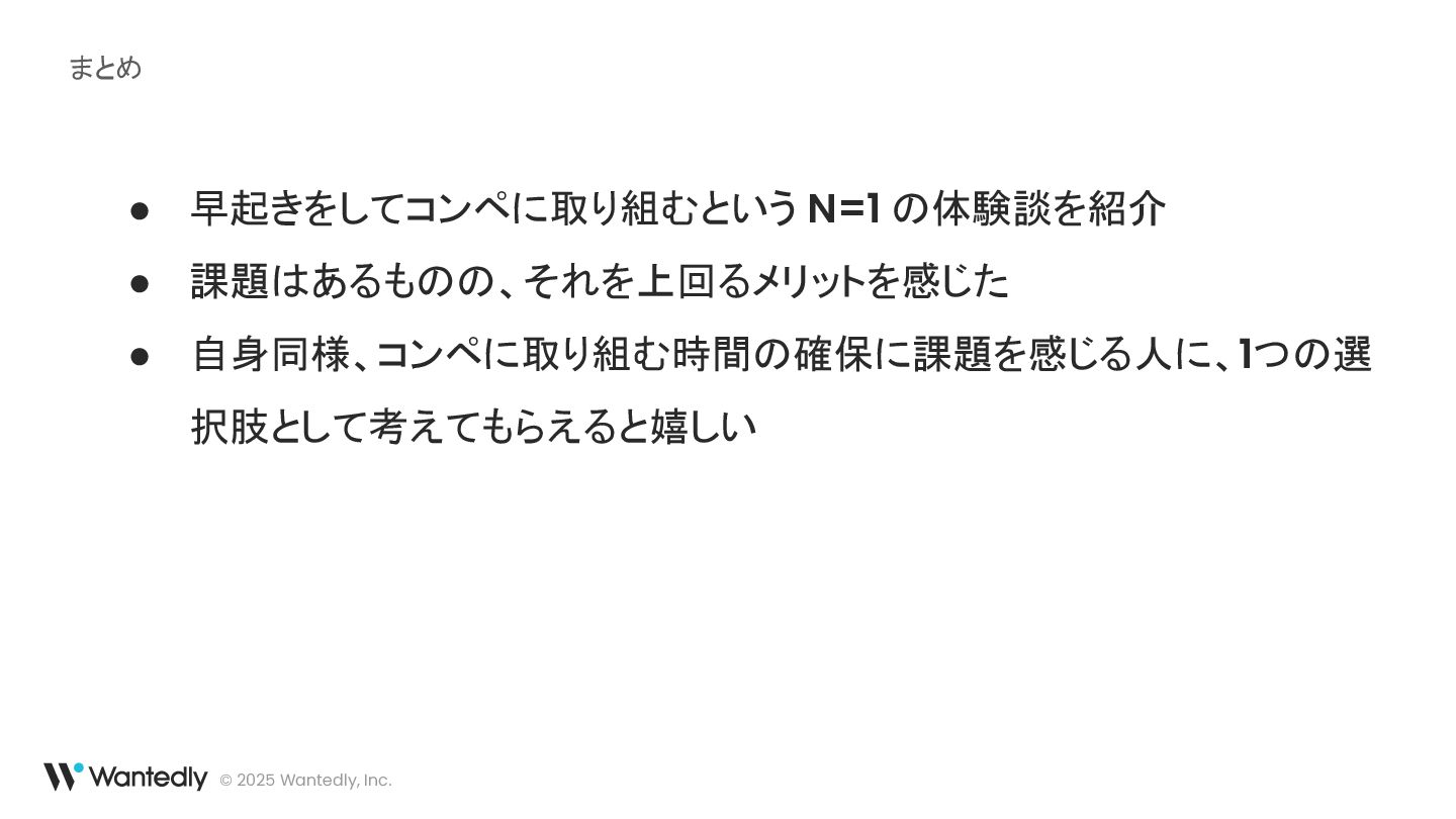 © 2025 Wantedly, Inc. まとめ • 早起きをしてコンペに取り組むという N=1 の体験談を紹介 •