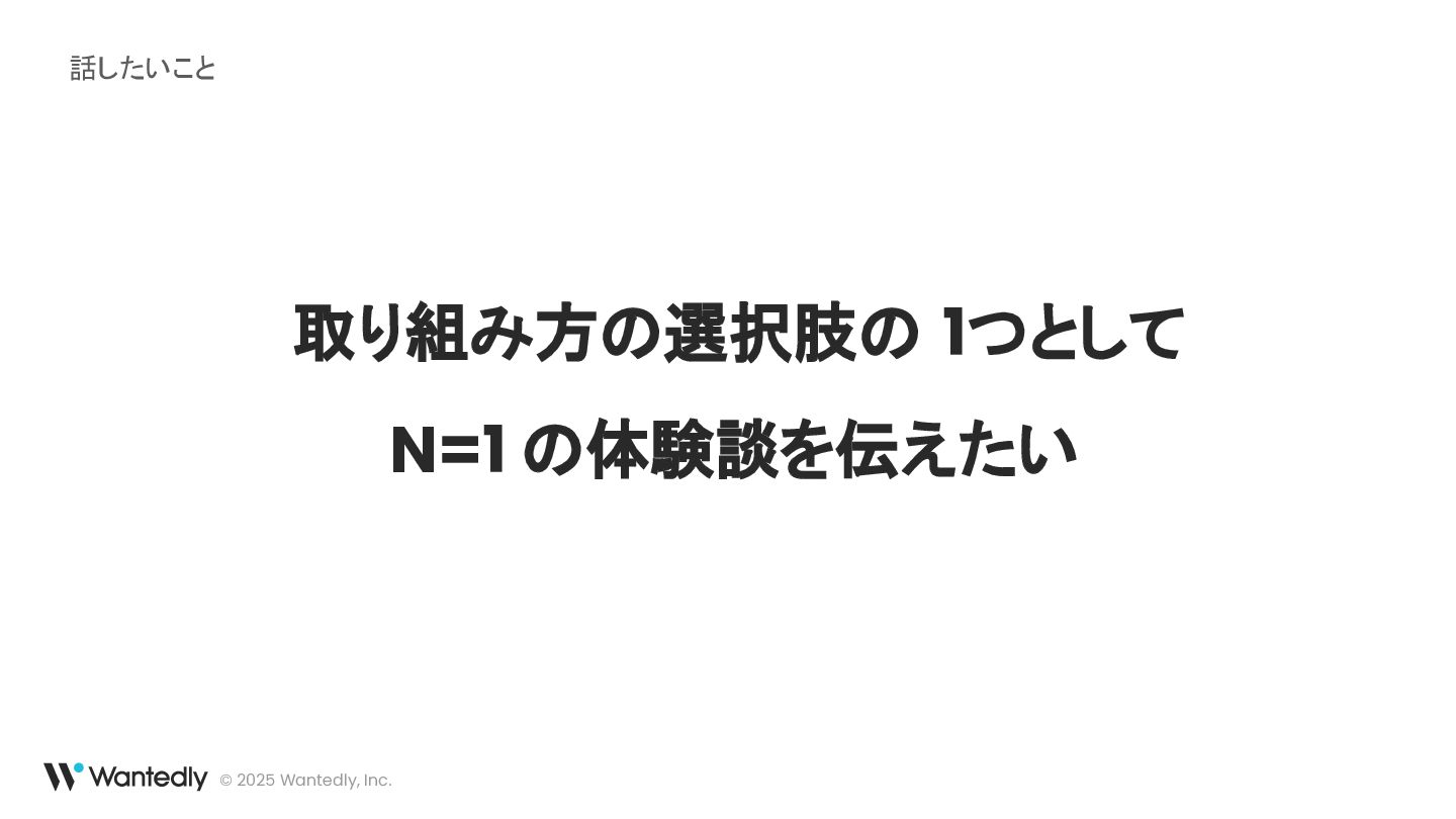 © 2025 Wantedly, Inc. 話したいこと 取り組み方の選択肢の 1つとして N=1 の体験談を伝えたい
