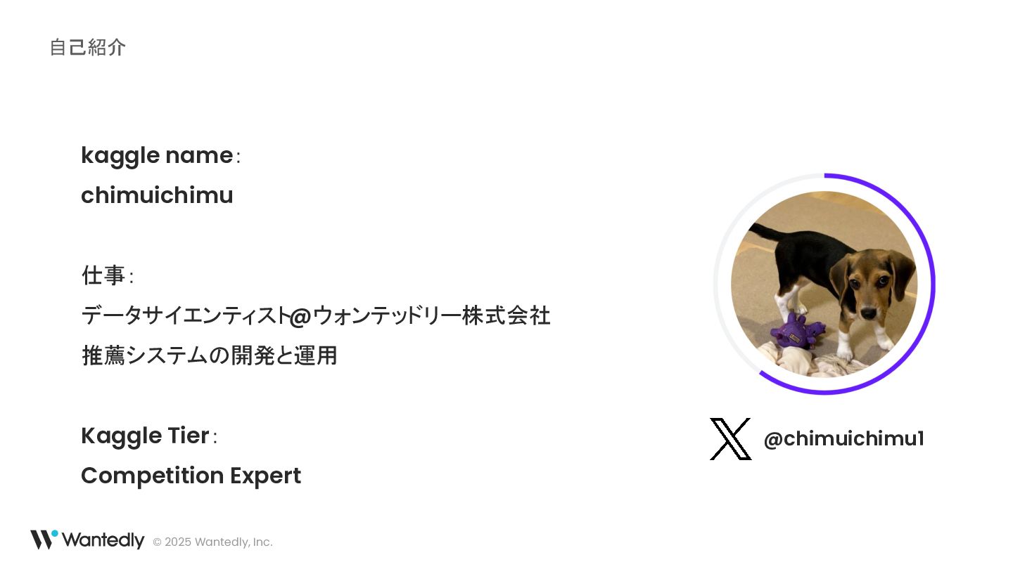 © 2025 Wantedly, Inc. 自己紹介 kaggle name: chimuichimu 仕事: データサイエンティスト@ウォンテッドリー株式会社