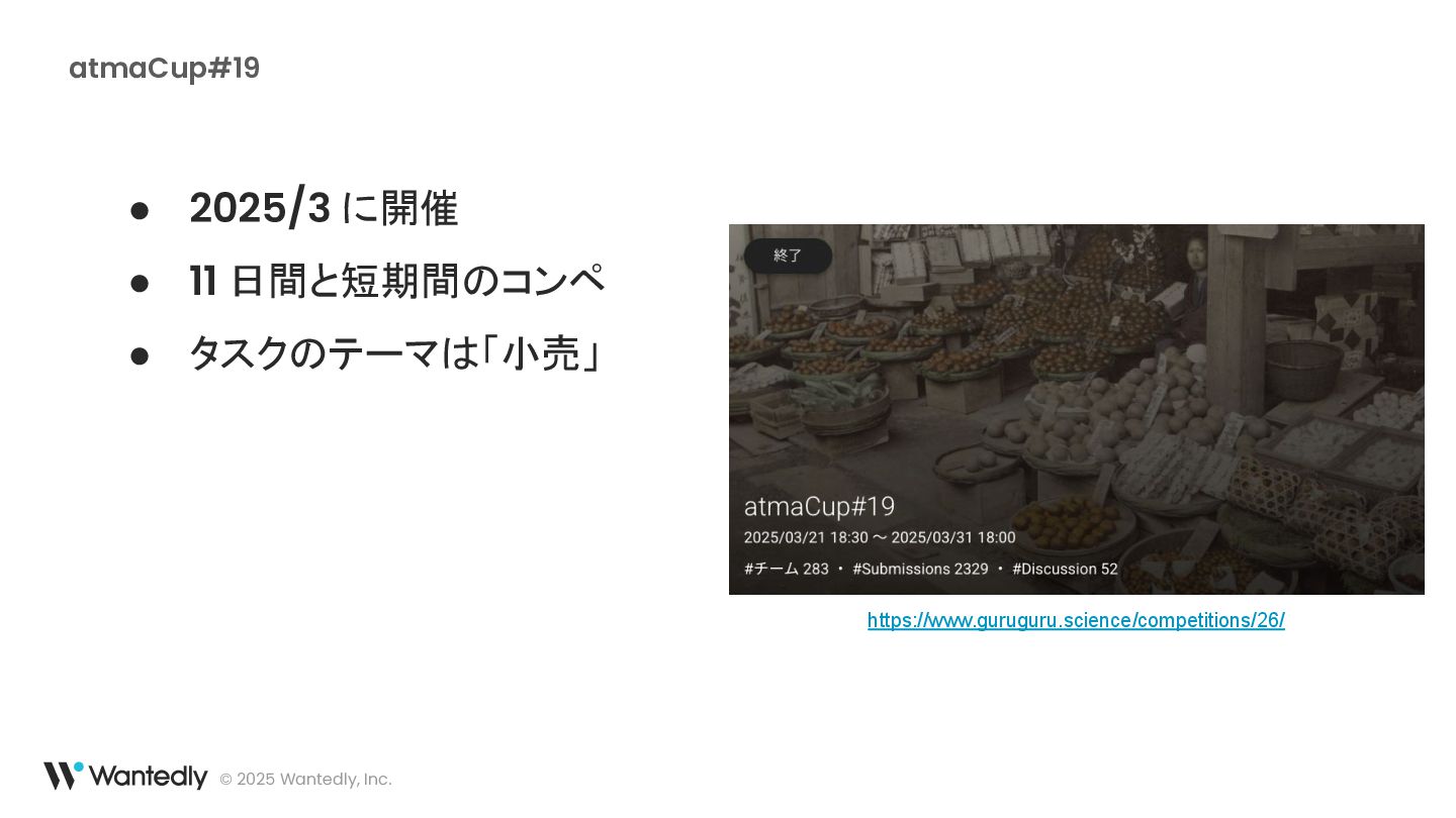 © 2025 Wantedly, Inc. atmaCup#19 • 2025/3 に開催 • 11