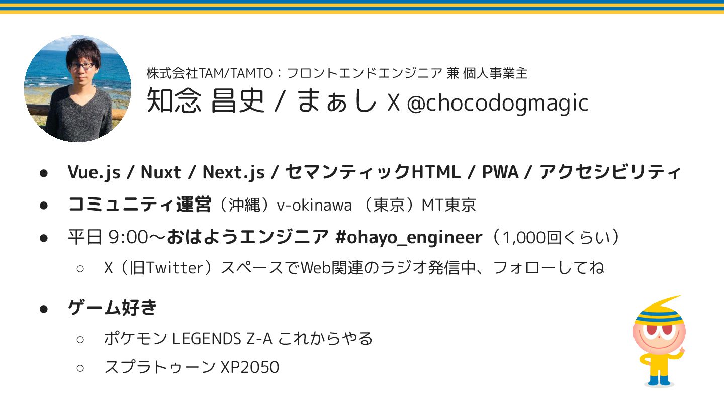Vue.js / Nuxt / Next.js / セマンティックHTML / PWA / アクセシビリティ • コミュニティ運営(沖縄)v-okinawa (東京)MT東京 • 平日 9:00〜おはようエンジニア #ohayo_engineer(1,000回くらい) ◦ X(旧Twitter)スペースでWeb関連のラジオ発信中、フォローしてね • ゲーム好き ◦ ポケモン LEGENDS Z-A これからやる ◦ スプラトゥーン XP2050