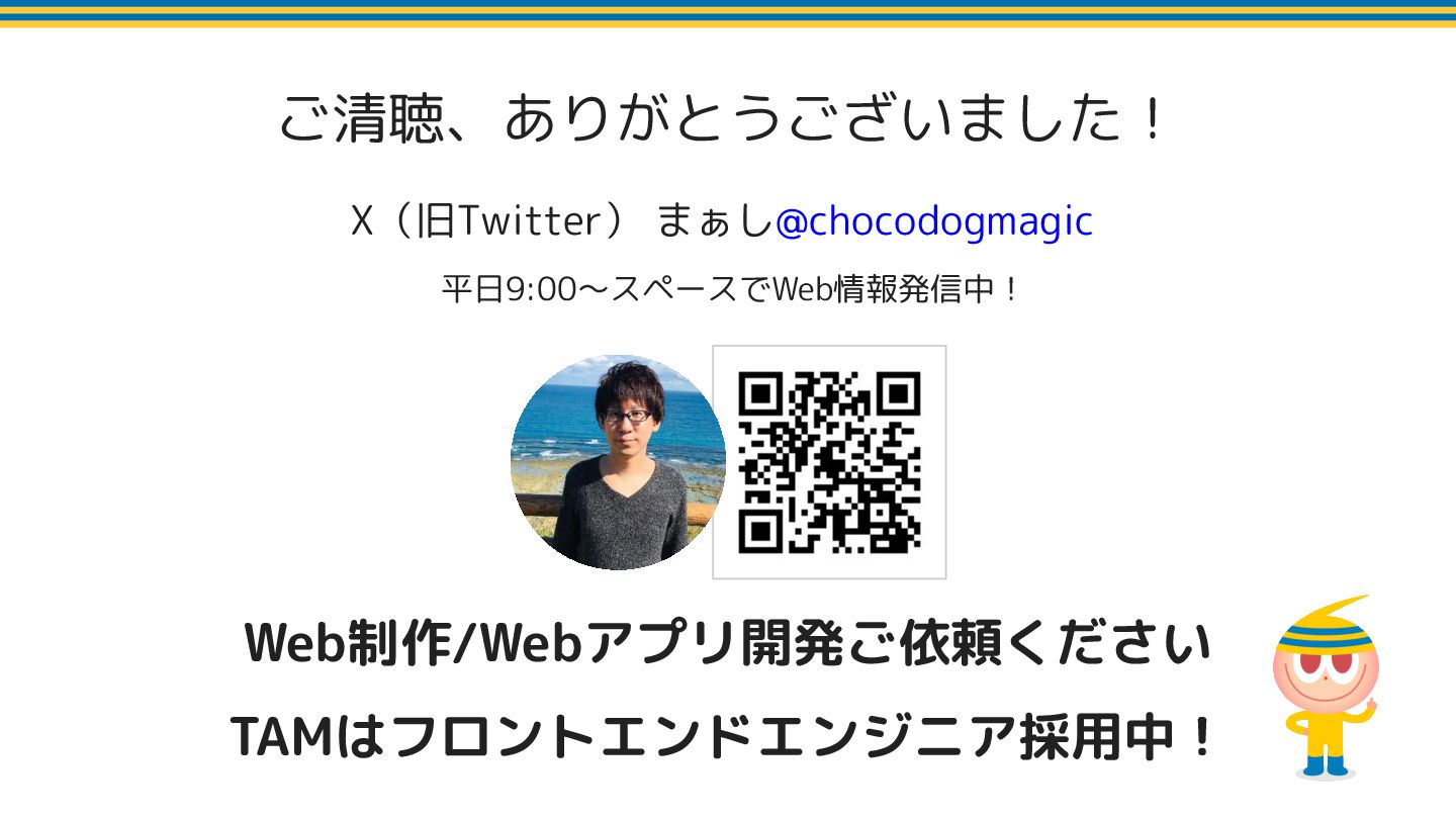 ご清聴、ありがとうございました! X(旧Twitter) まぁし@chocodogmagic 平日9:00〜スペースでWeb情報発信中! Web制作/Webアプリ開発ご依頼ください TAMはフロントエンドエンジニア採用中!