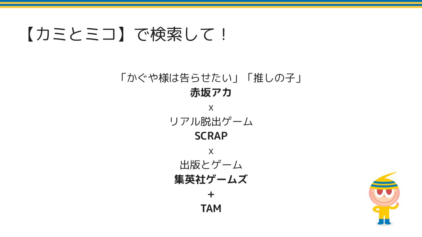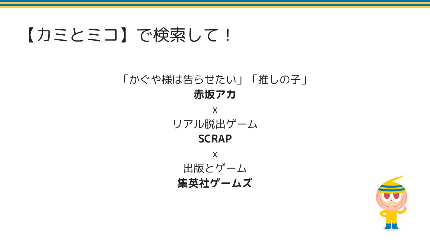 【カミとミコ】で検索して! 「かぐや様は告らせたい」「推しの子」 赤坂アカ x リアル脱出ゲーム SCRAP x 出版とゲーム 集英社ゲームズ +