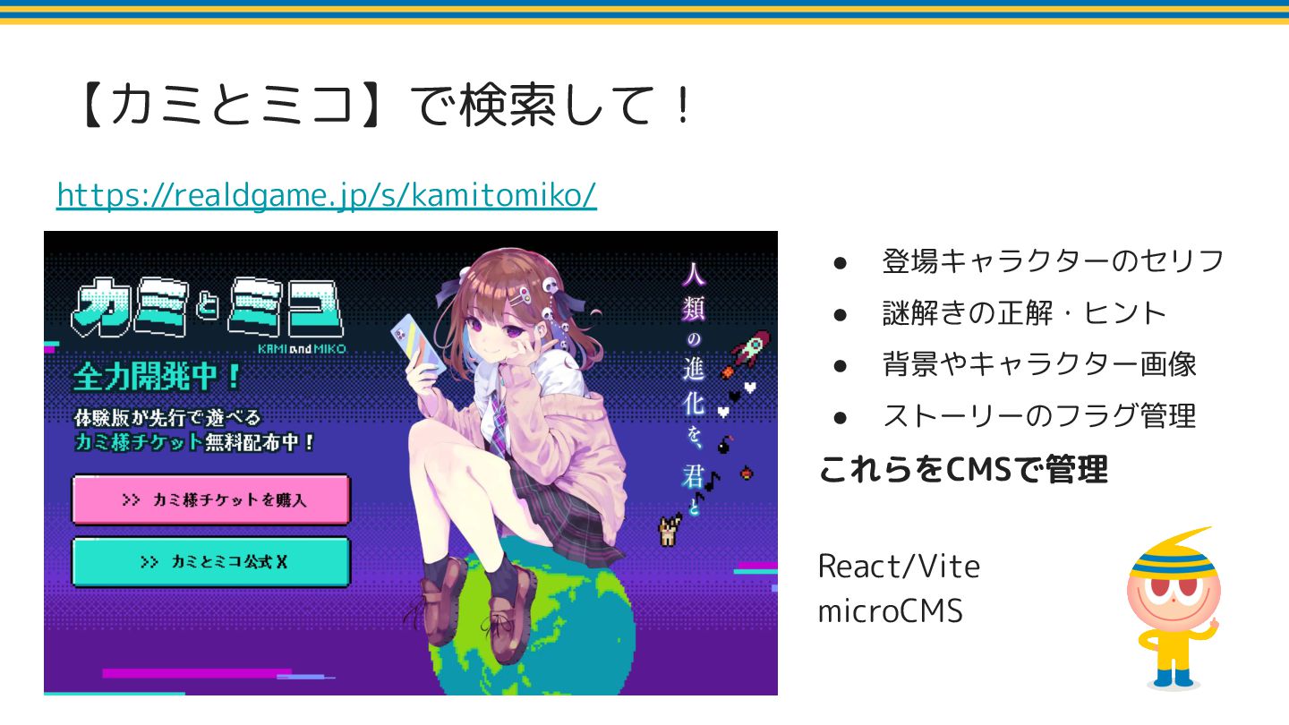 【カミとミコ】で検索して! https://realdgame.jp/s/kamitomiko/ • 登場キャラクターのセリフ • 謎解きの正解・ヒント • 背景やキャラクター画像 •