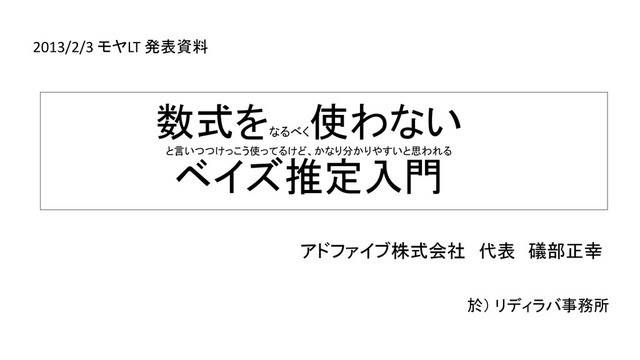 100%) {好きa%, ちょっと好きb%, なんともc%, 嫌いc%, 大嫌いd%} (a+b+c+d = 100%) {超好きa%, 大好きb%, 好きc%, ちょっと好きd%, なんともe%, 嫌いf%, 大嫌いg%, キモいh% } (a+b+c+d+e+f+g+h = 100%) 以下、無限にパターンを秘めている この例だと、もともとが「好き⇔嫌い」という1次元の数直線で表せるけど、「友達としてどうこう」とか質的に異 なるパラメータがいっぱい考えられるようなケースを全部「想定内」におさめたいというニーズは当然ある。 そんなのできるのか? ⇨ できるんです、そう、ノンパラベイズならね。 この例は「ディリクレ過程」というのを使うとできる。実際に使うと、データ(態度)に応じてa,b,c,d,e,…というパラ メータ(女心)の各確率が計算できるようになる。 (変数がいくつ出てくるか分からないのに足したら100%になるようにパラメータを計算できる。スゲー。)