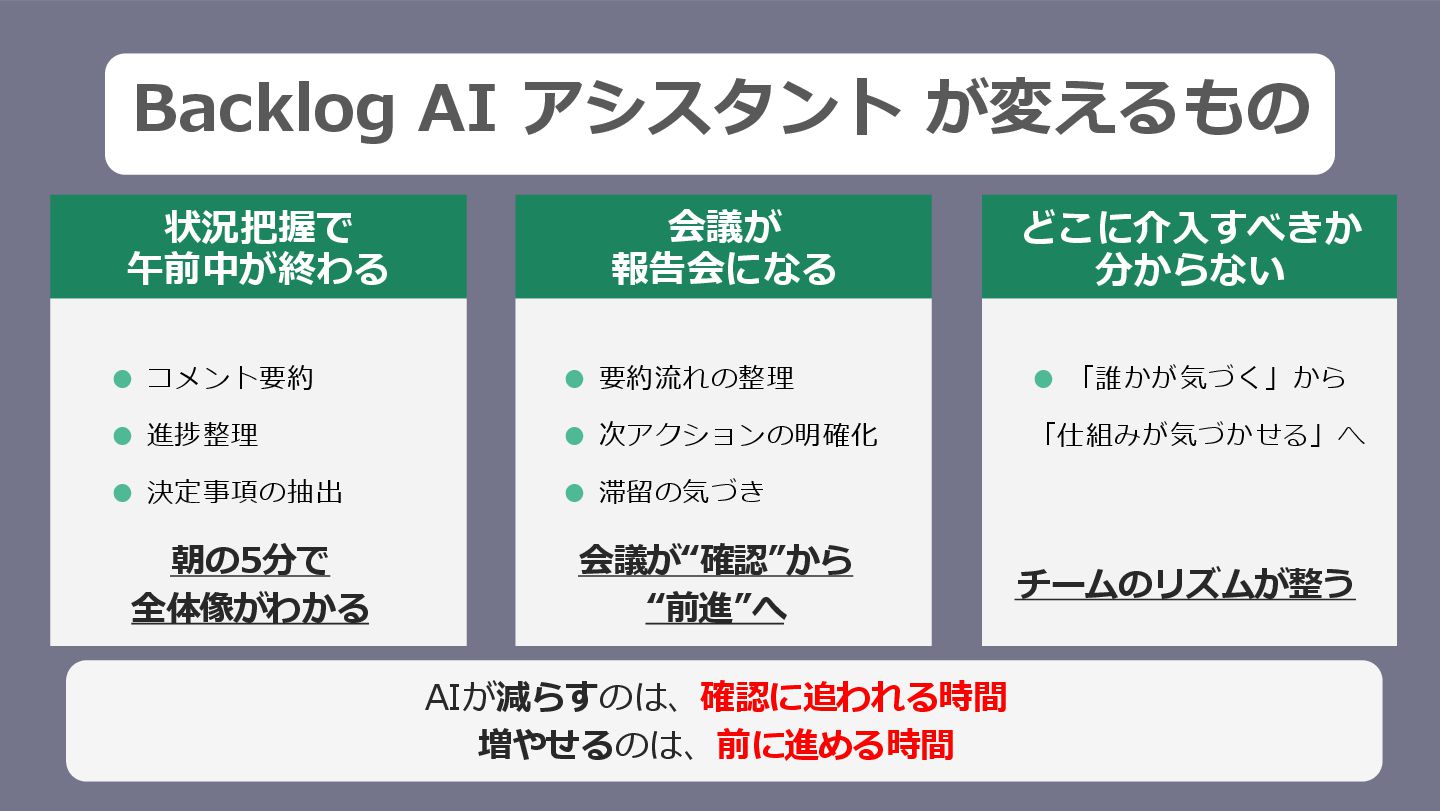 Backlog AI アシスタント が変えるもの 状況把握で 午前中が終わる • コメント要約 • 進捗整理