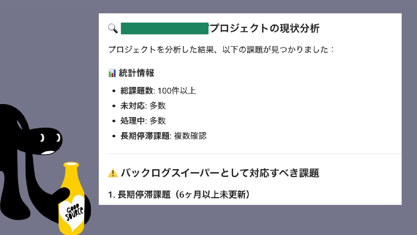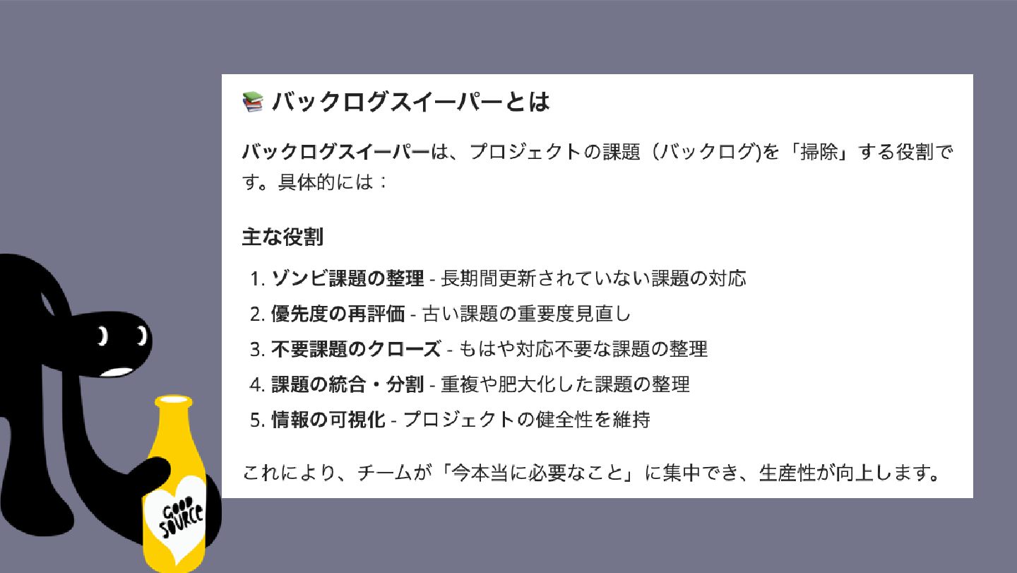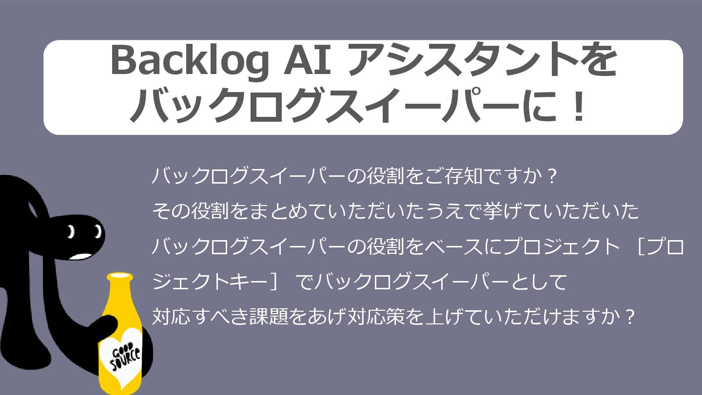 Backlog AI アシスタントを バックログスイーパーに! バックログスイーパーの役割をご存知ですか? その役割をまとめていただいたうえで挙げていただいた バックログスイーパーの役割をベースにプロジェクト [プロ ジェクトキー] でバックログスイーパーとして