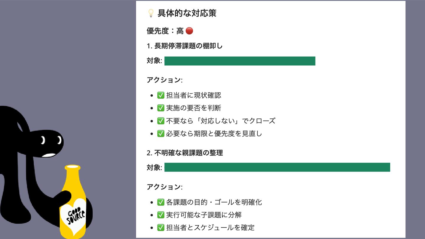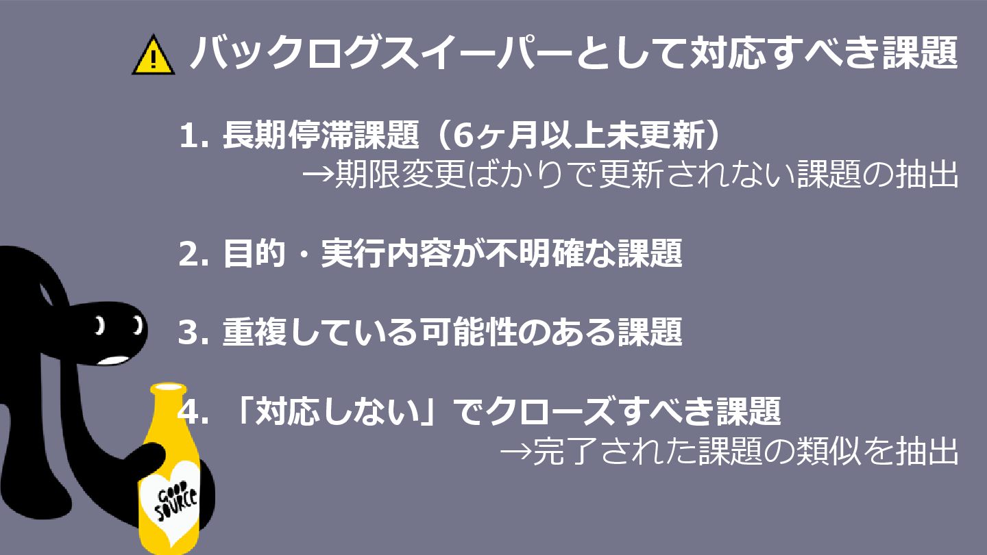 バックログスイーパーとして対応すべき課題 1. 長期停滞課題(6ヶ月以上未更新) →期限変更ばかりで更新されない課題の抽出 2. 目的・実行内容が不明確な課題 3. 重複している可能性のある課題 4. 「対応しない」でクローズすべき課題