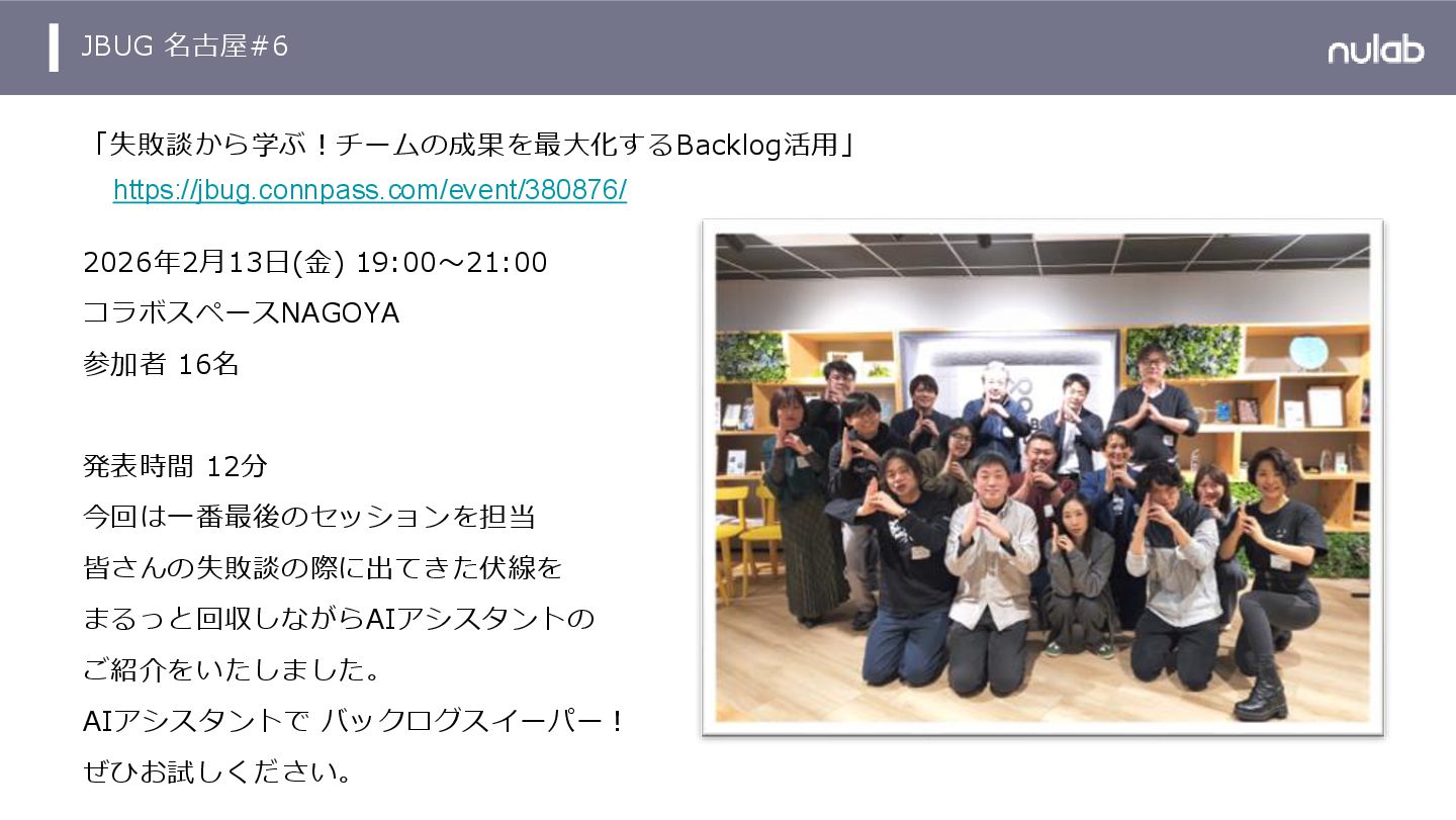 JBUG 名古屋#6 「失敗談から学ぶ!チームの成果を最大化するBacklog活用」 2026年2月13日(金) 19:00〜21:00 コラボスペースNAGOYA 参加者 16名 発表時間 12分