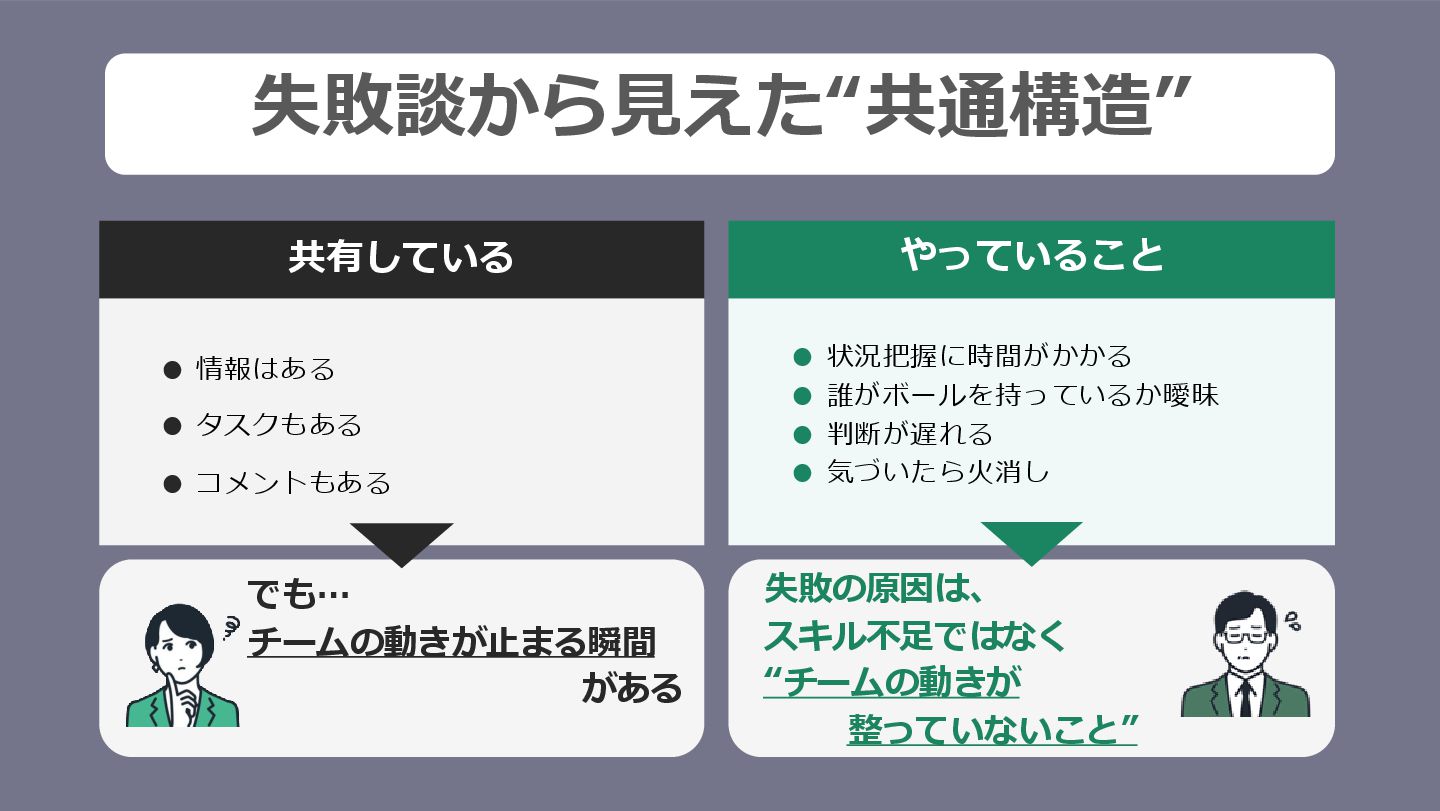 失敗談から見えた“共通構造” 共有している • 情報はある • タスクもある • コメントもある やっていること •