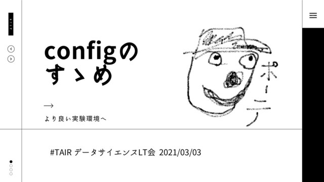 実行環境が変わるとき、パスで詰みませんか。また、コードを人と 共有したとき、何を変更したら良いかわかるようにしたいですよ ね。configだけの変更で済めば頭を使う必要がなくなります。 C O N F I G の す ゝ め 02 再 現 性 汎 用 性 読 み や す さ config管理の必要性