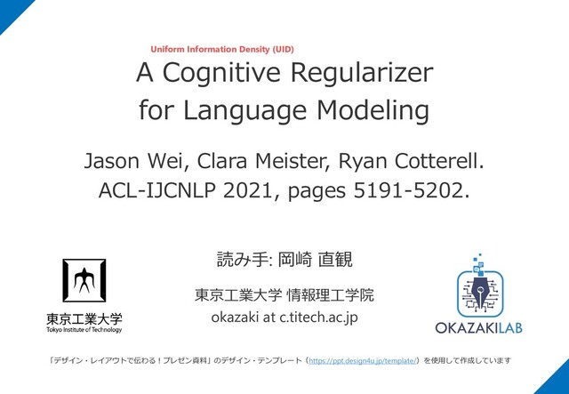 Ryan Cotterell. ACL-IJCNLP 2021, pages 5191-5202. 読み手: 岡崎 直観 東京工業大学 情報理工学院 okazaki at c.titech.ac.jp 「デザイン・レイアウトで伝わる!プレゼン資料」のデザイン・テンプレート(https://ppt.design4u.jp/template/)を使用して作成しています Uniform Information Density (UID)