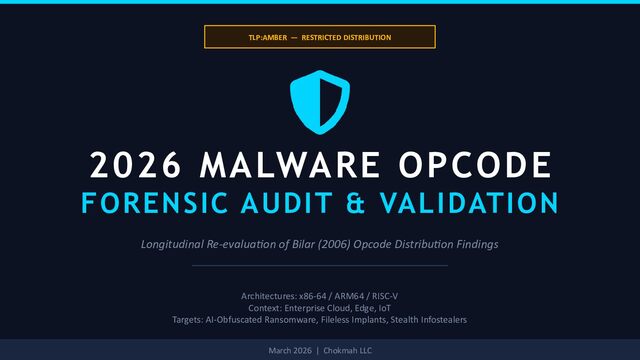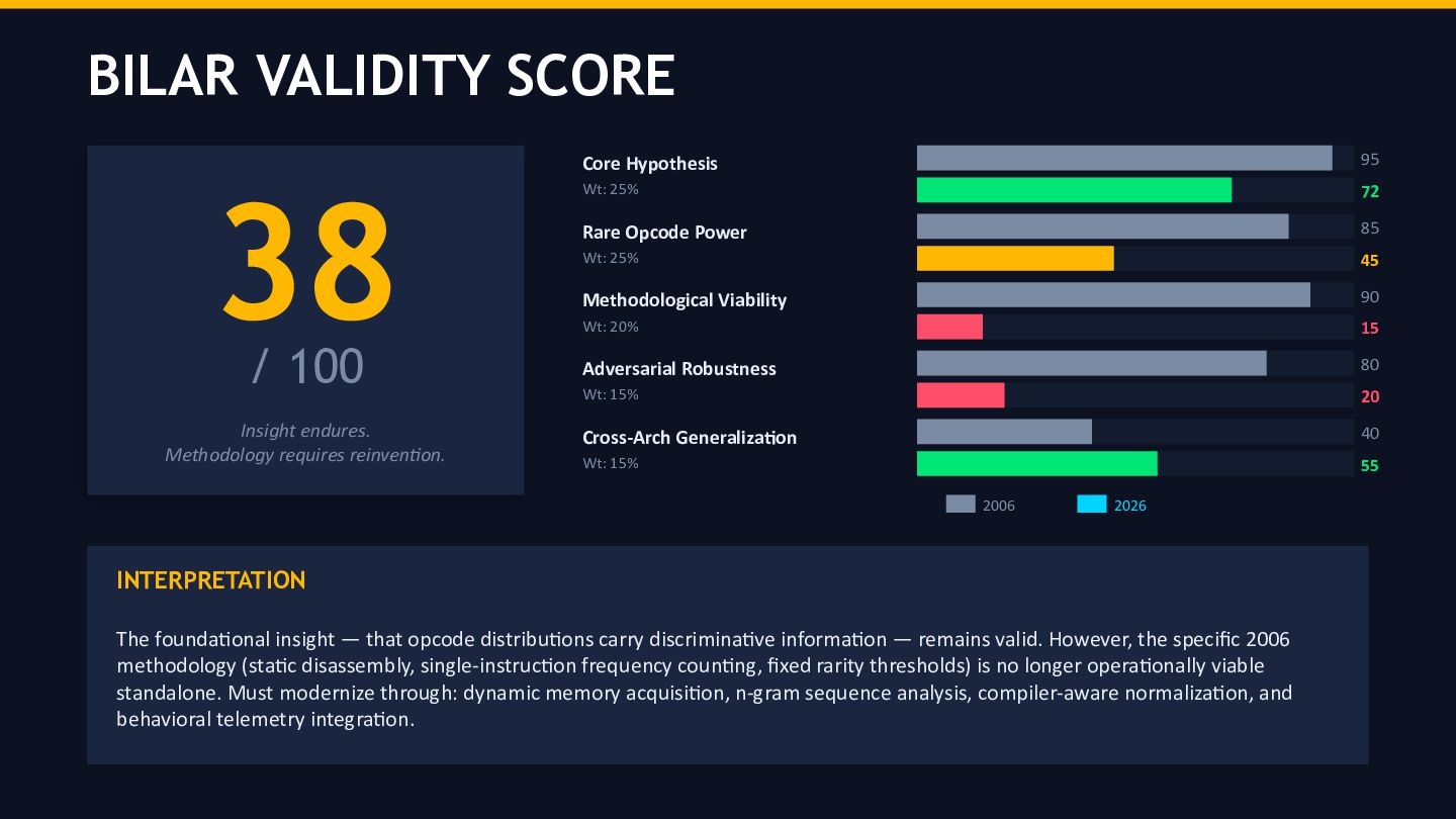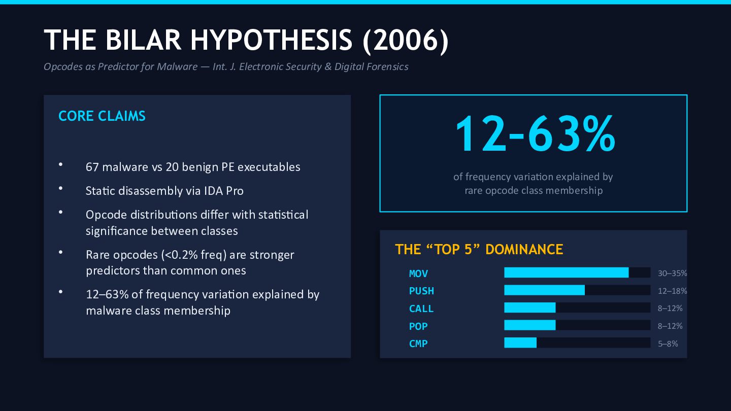 This report presents a longitudinal forensic validation of Bilar’s 2006 research on opcode frequency distributions as predictors of malicious software. Bilar’s original study, published in the International Journal of Electronic Security and Digital Forensics, demonstrated that malware opcode distributions differ in statistically significant ways from benign software, with rare opcodes explaining between 12–63% of frequency variation between the two classes.