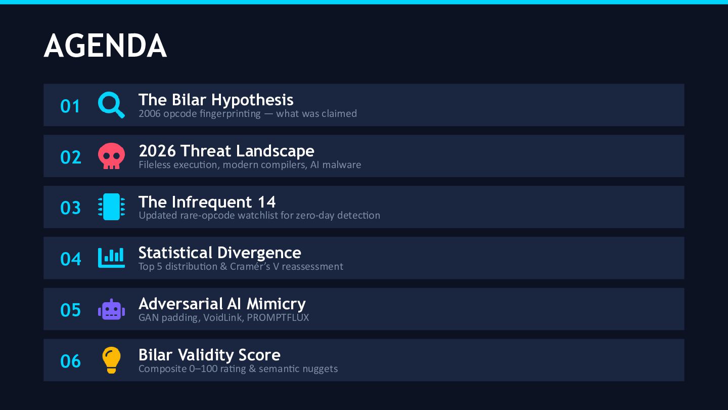 Twenty years later, the threat landscape has undergone a fundamental transformation. The dominant malware paradigm has shifted from disk-resident PE executables compiled in C/C++ to memory-resident, fileless implants authored in Rust, Go, and Zig—often with direct assistance from large language models. This audit re-examines whether Bilar’s structural fingerprinting hypothesis retains validity under these conditions, and what adaptations are required to maintain opcode-based detection as a viable forensic heuristic.