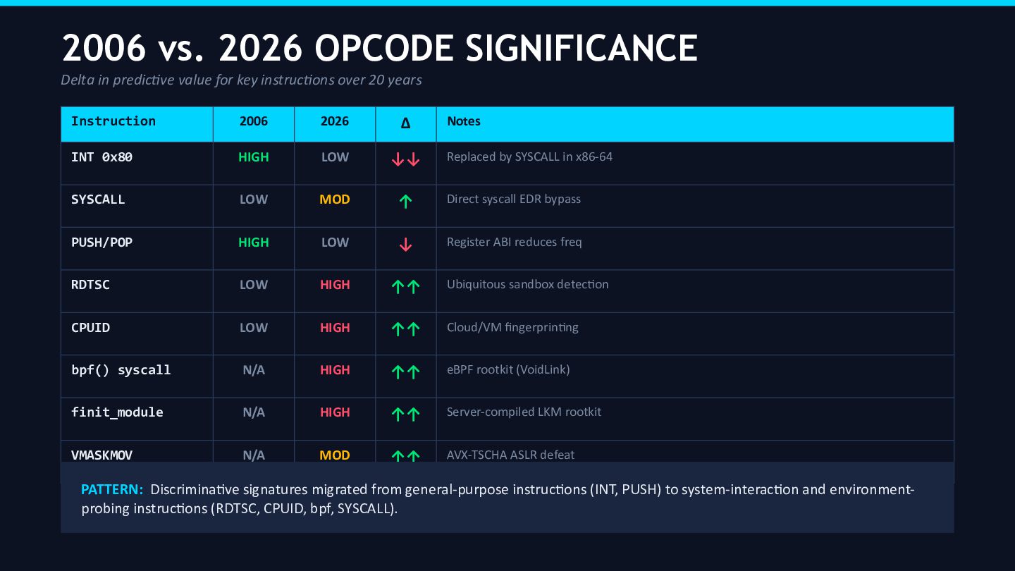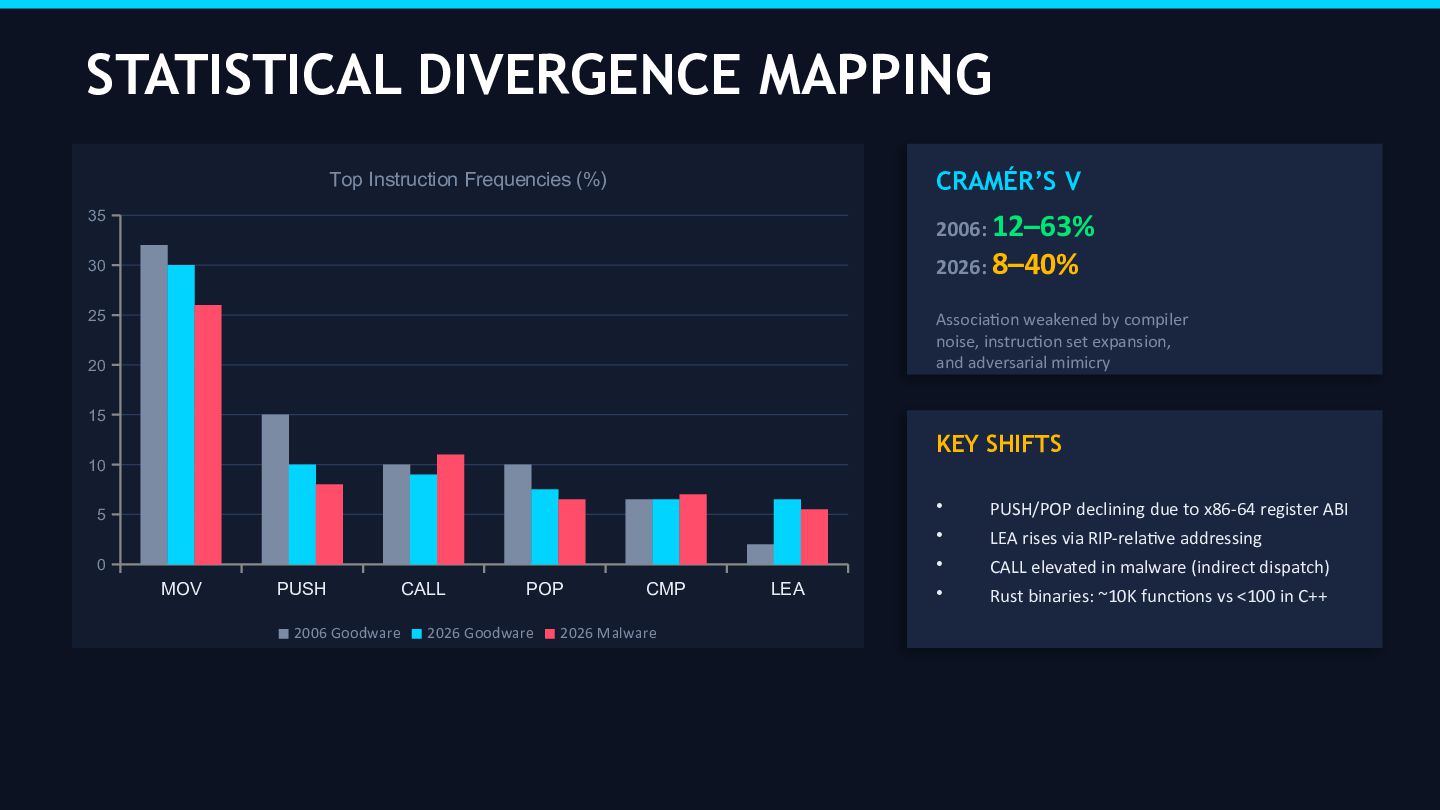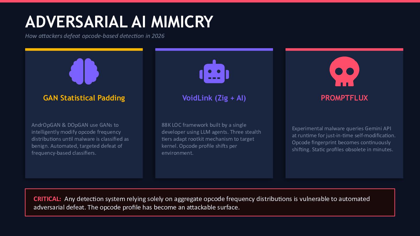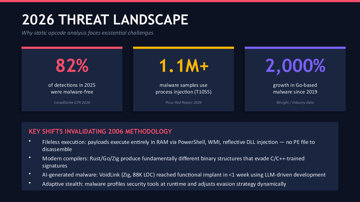 Key findings include: the core statistical divergence between malware and goodware opcode distributions persists at the architectural level, but the discriminative power of individual rare opcodes has degraded substantially. The “Top 5” instruction dominance pattern (mov, push, call, pop, cmp) identified by Bilar remains observable but is now actively targeted by adversarial AI mimicry techniques. Process injection (MITRE ATT&CK T1055) has become the single most prevalent malware technique, observed across more than 1.1 million samples in the Picus Red Report 2026, rendering static disk disassembly largely obsolete as a primary acquisition method. The emergence of VoidLink a Zig-based, AI-generated malware framework documented by Check Point, Sysdig, and Cisco Talos in January–February 2026 serves as the canonical case study for this audit.