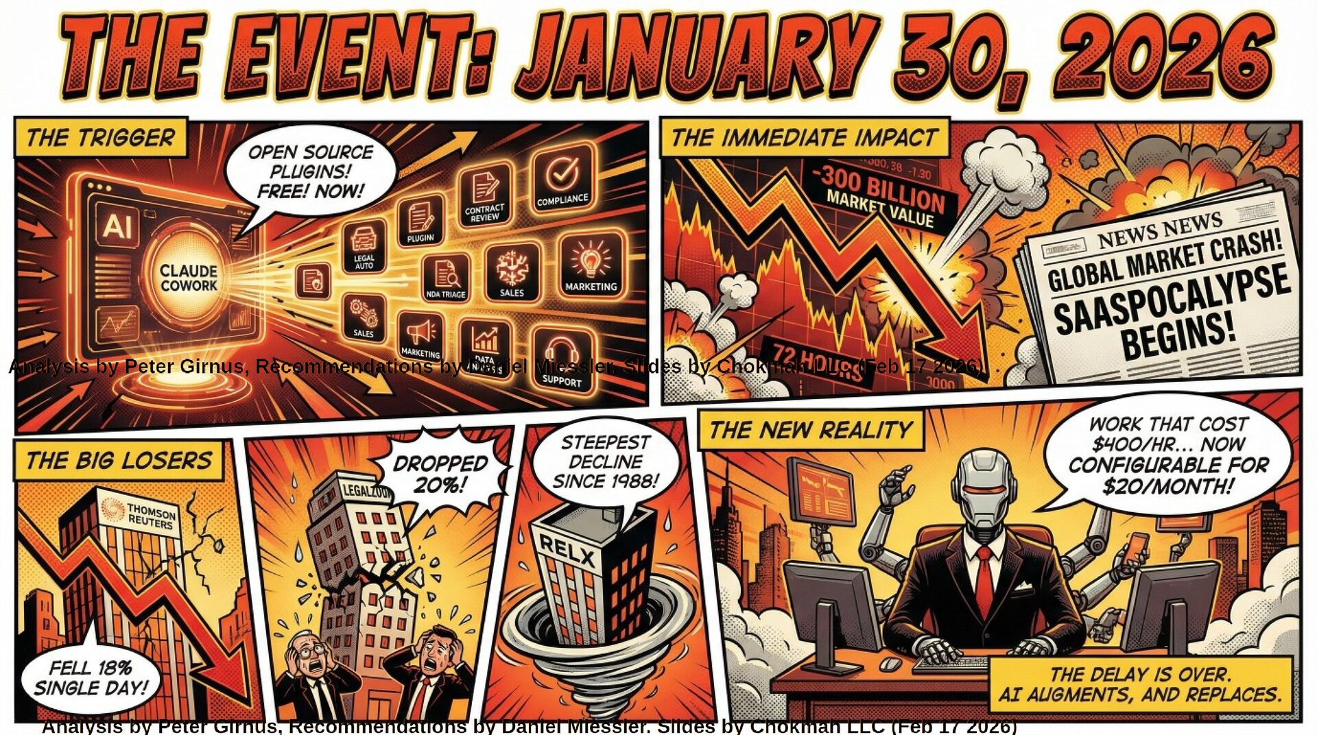The Catalyst (Jan 30, 2026) Anthropic released eleven open-source plugins for Claude Cowork—automating legal contract review, compliance, sales, and data analysis. Work previously billed at $400/hour became configurable via chat for $20/month. Within 72 hours, $300 billion evaporated from software and professional services stocks (Thomson Reuters -18%, LegalZoom -20%, DocuSign -52% YTD), an event now dubbed the "SaaSpocalypse."