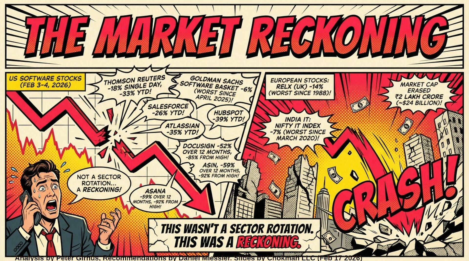 Losers: Traditional SaaS (Salesforce -26%, HubSpot -39%), legal publishing (RELX -14%), Indian IT services (Infosys -8%), and any model predicated on "billable hours" or "per-seat" licensing.