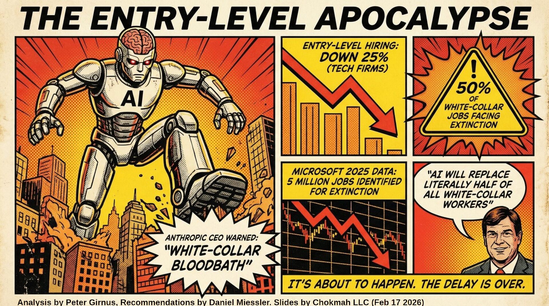 Ground Zero: Professional Services Big Law’s $800-$2,000/hour model faces existential threat. Claude performs NDA triage and contract review instantly without student loans, sleep, or partnership ambitions. Entry-level hiring in law, consulting, and finance is projected to drop 30-50%, with analysts warning of a "white-collar bloodbath" affecting 50% of entry-level knowledge work.