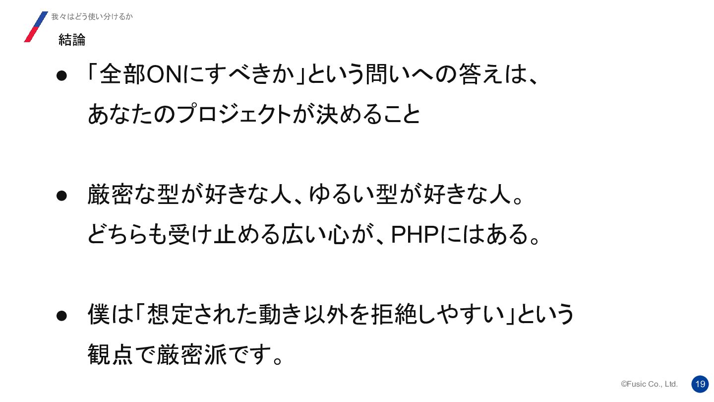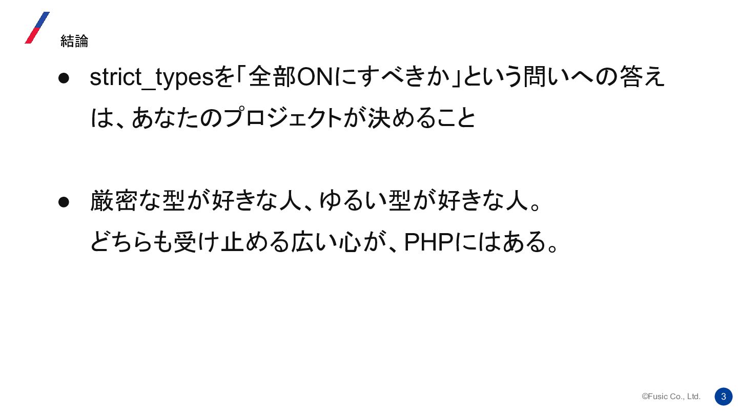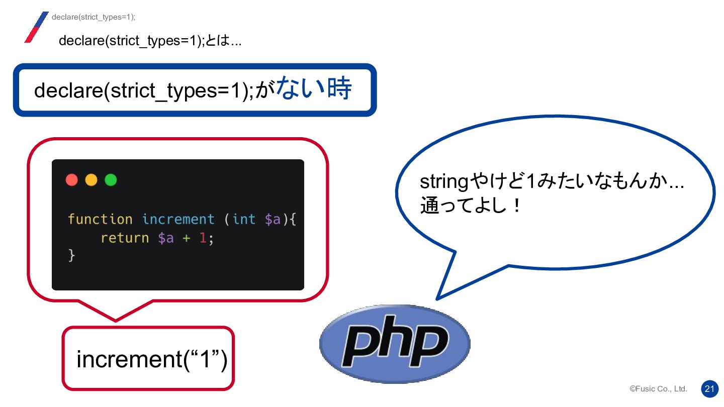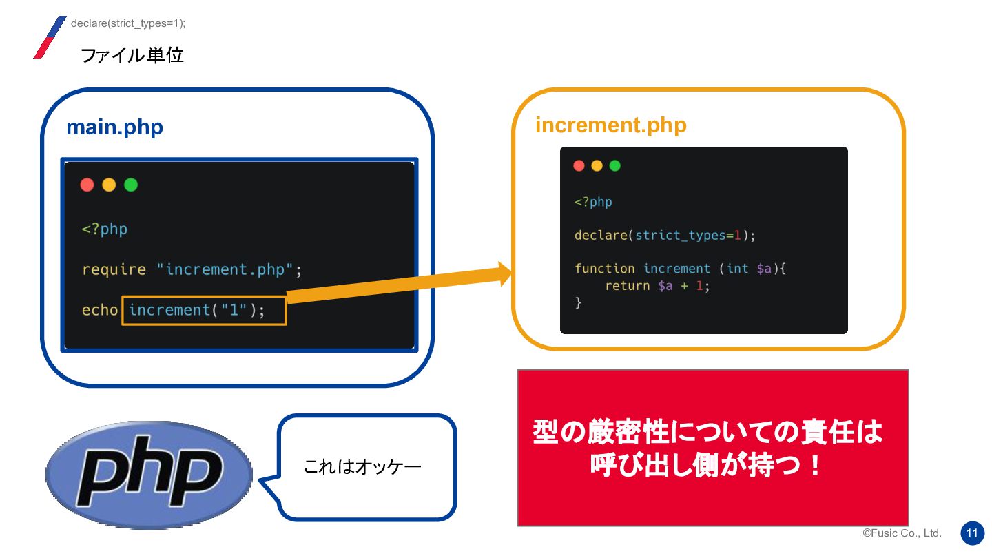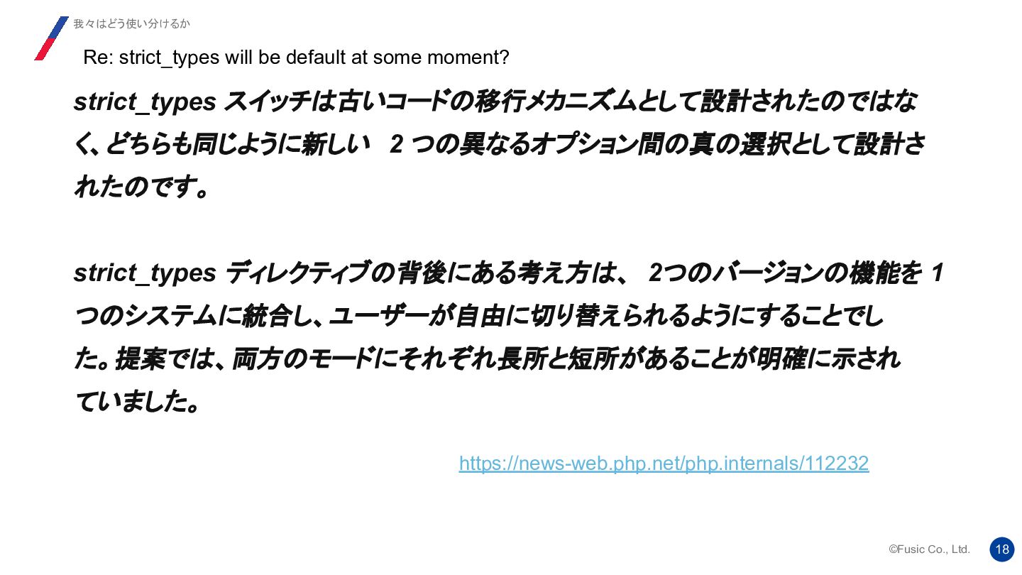 strict_types ディレクティブの背後にある考え方は、 2つのバージョンの機能を 1 つのシステムに統合し、ユーザーが自由に切り替えられるようにすることでし た。提案では、両方のモードにそれぞれ長所と短所があることが明確に示され ていました。 Re: strict_types will be default at some moment? 我々はどう使い分けるか https://news-web.php.net/php.internals/112232