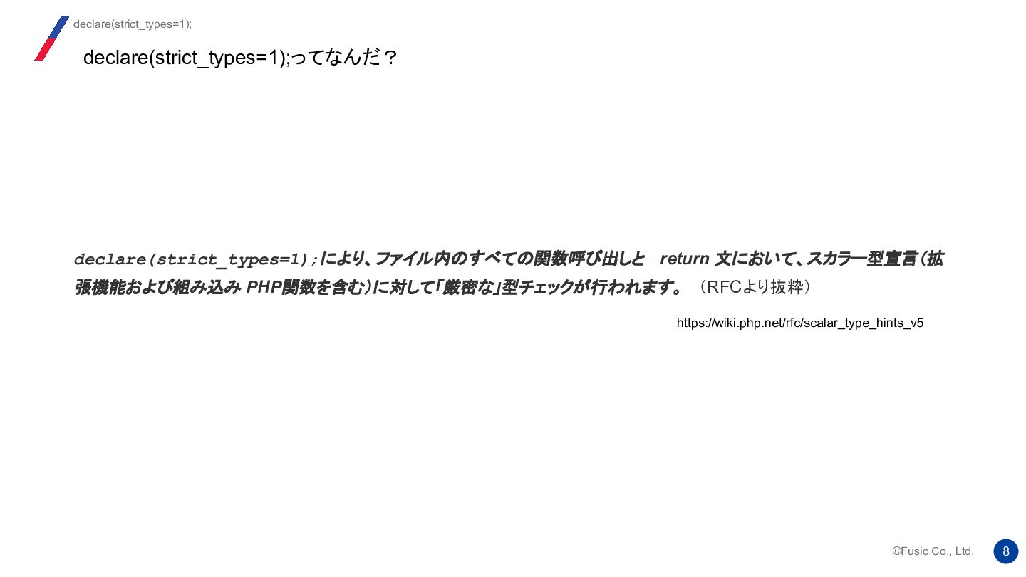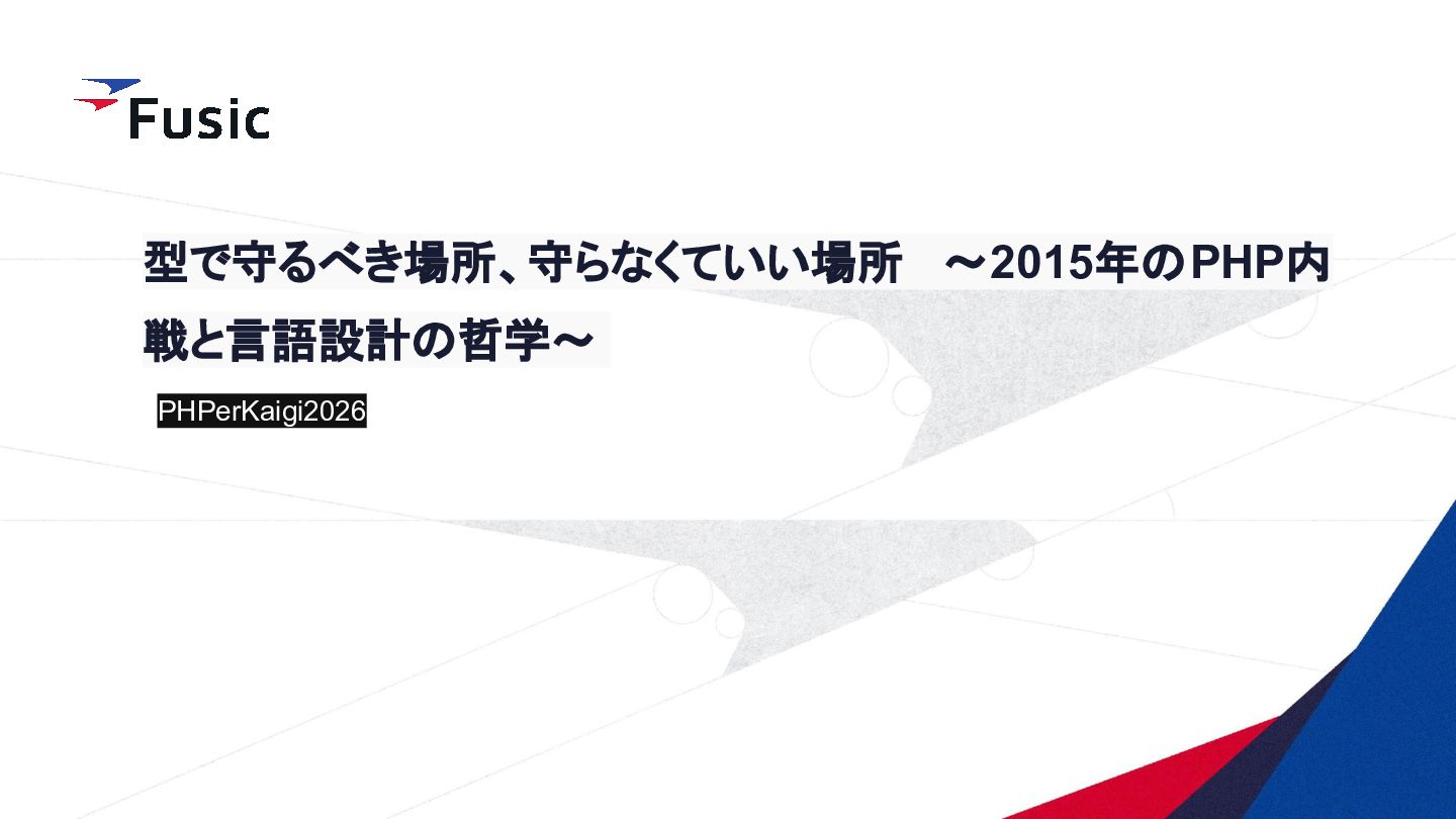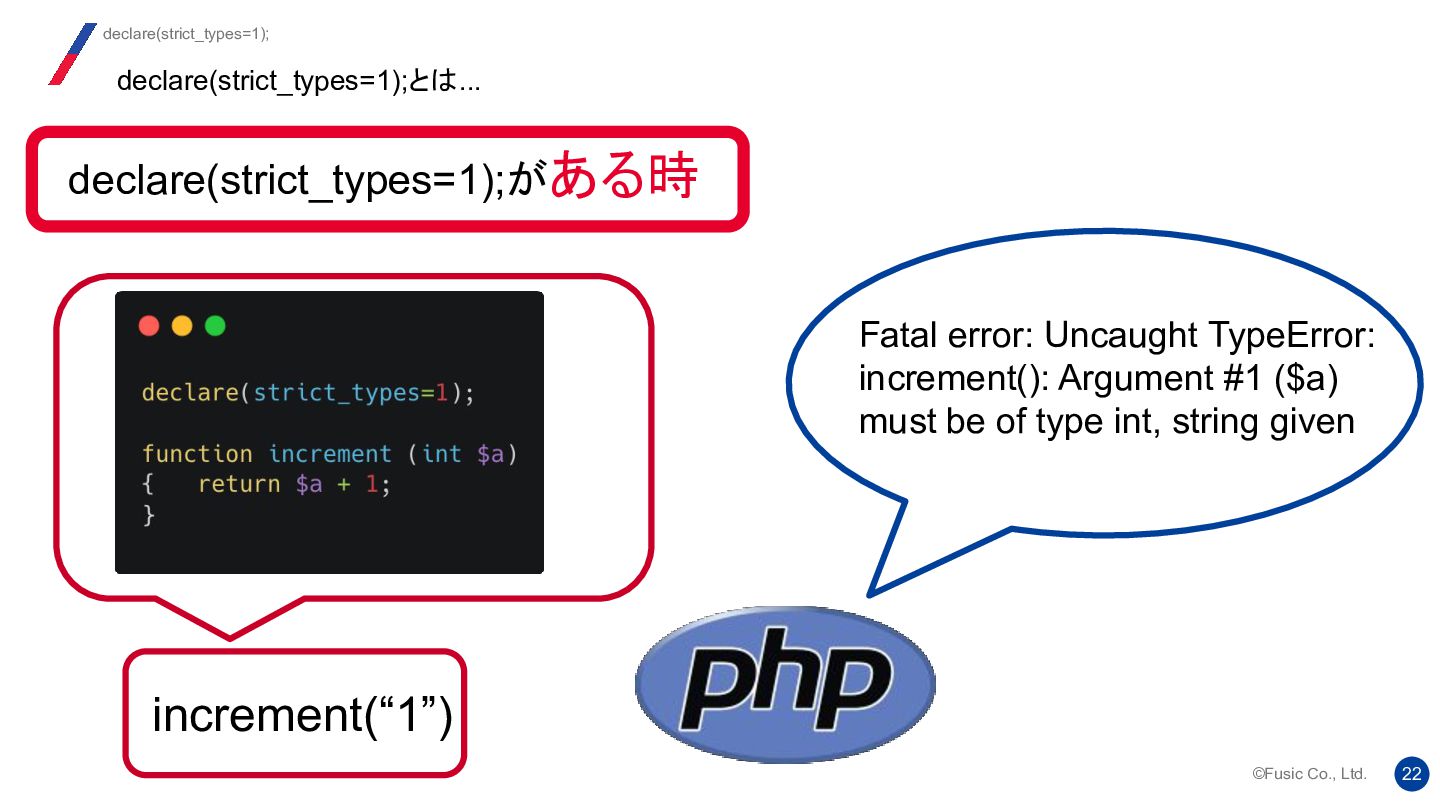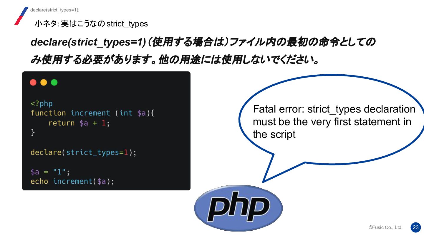 strict_types ディレクティブの背後にある考え方は、 2つのバージョンの機能を 1 つのシステムに統合し、ユーザーが自由に切り替えられるようにすることでし た。提案では、両方のモードにそれぞれ長所と短所があることが明確に示され ていました。 Re: strict_types will be default at some moment? 我々はどう使い分けるか https://news-web.php.net/php.internals/112232