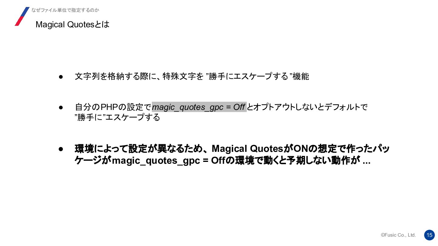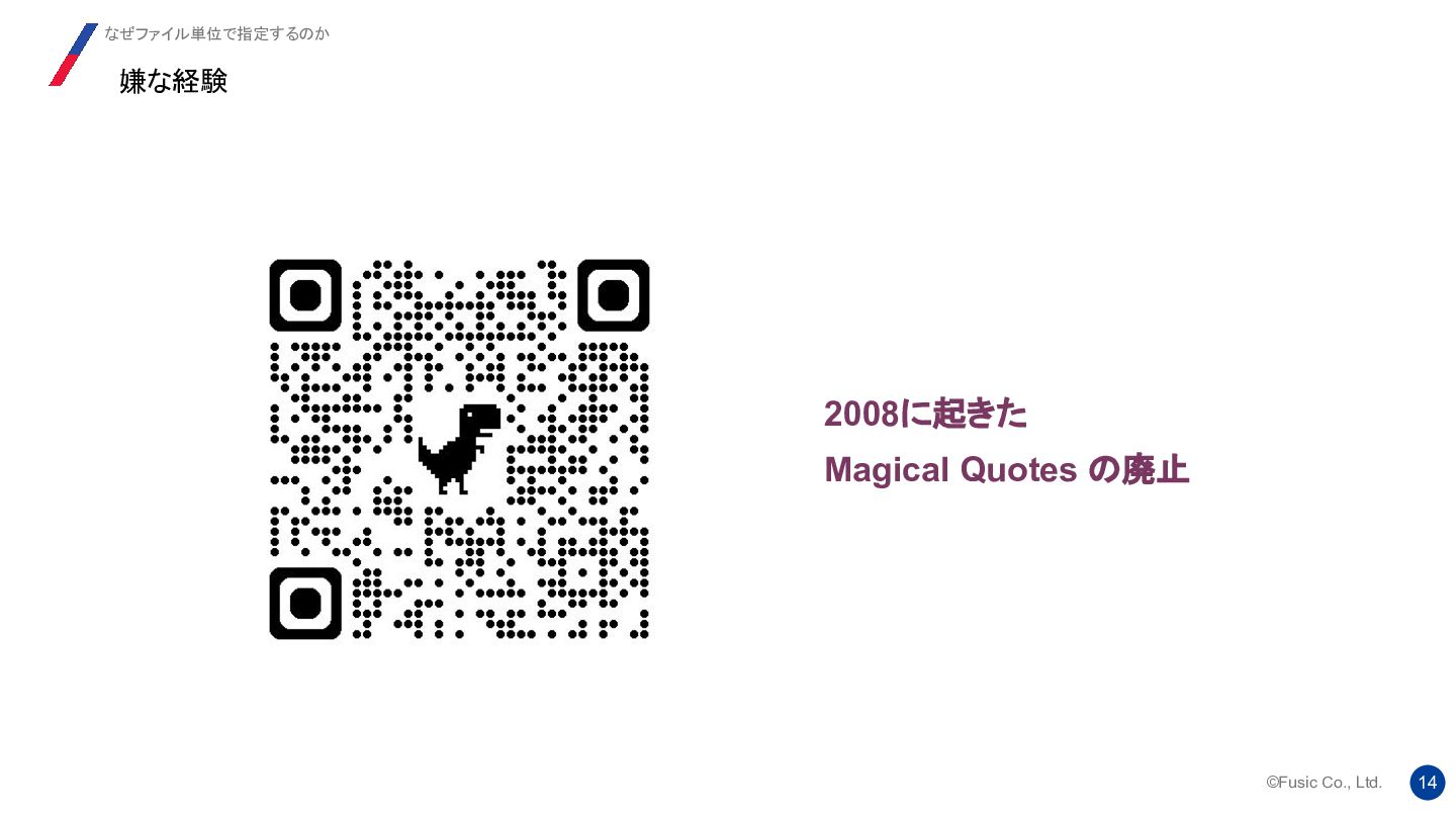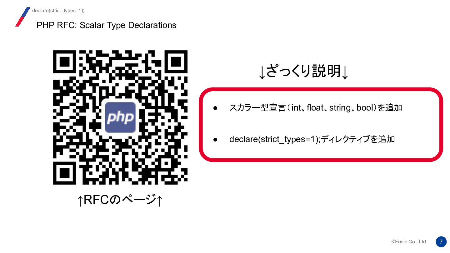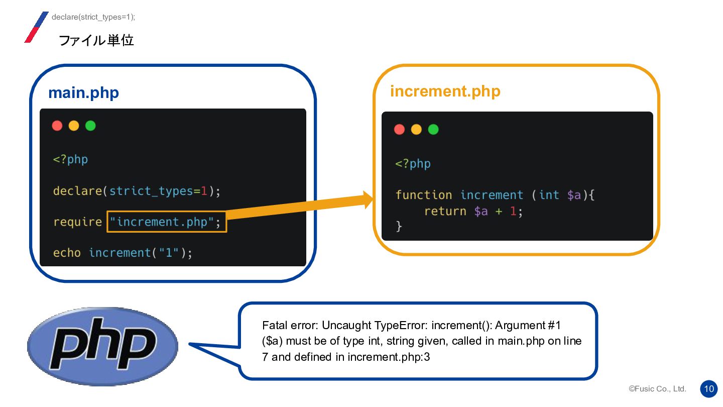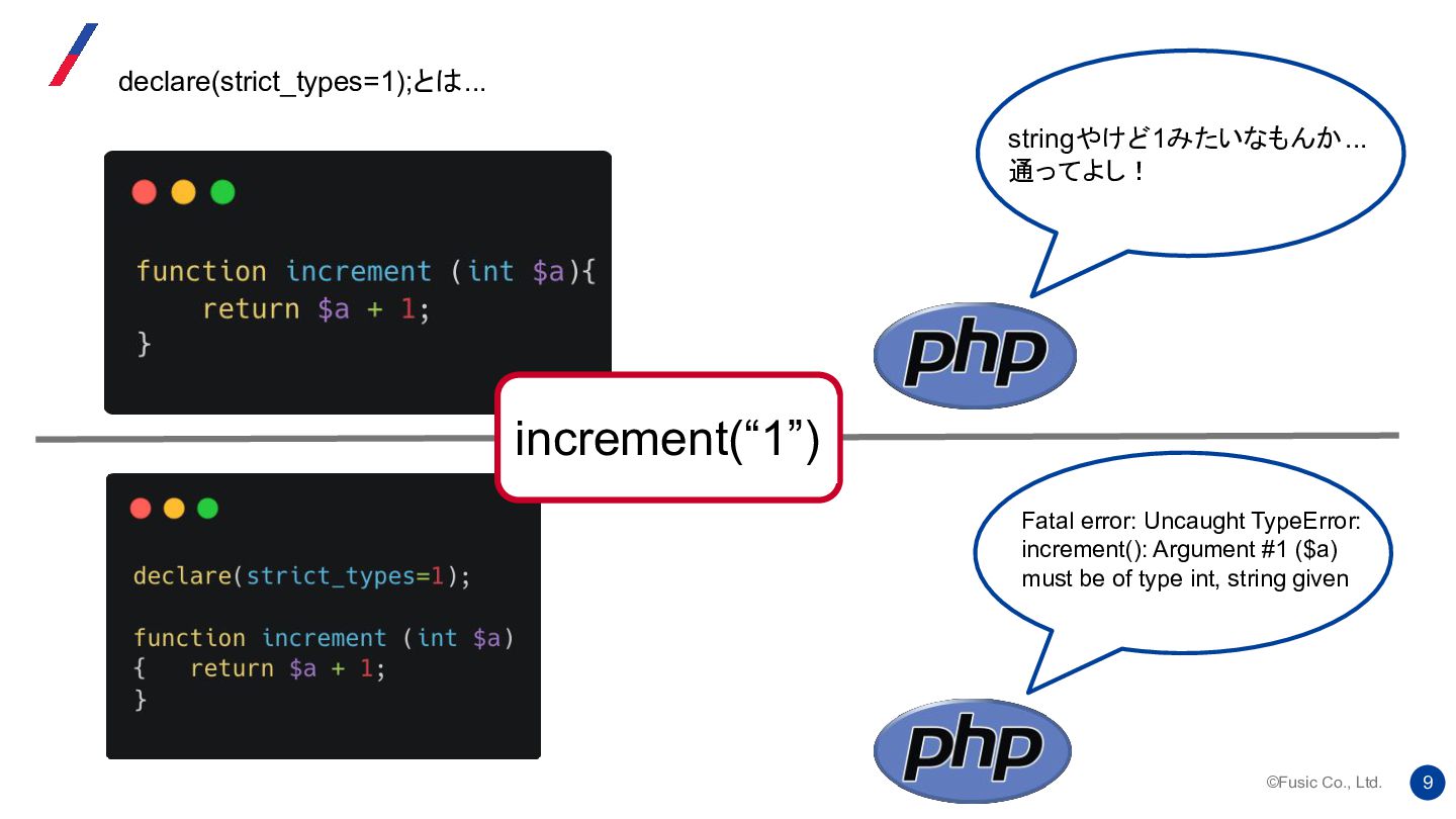 strict_types ディレクティブの背後にある考え方は、 2つのバージョンの機能を 1 つのシステムに統合し、ユーザーが自由に切り替えられるようにすることでし た。提案では、両方のモードにそれぞれ長所と短所があることが明確に示され ていました。 Re: strict_types will be default at some moment? 我々はどう使い分けるか https://news-web.php.net/php.internals/112232