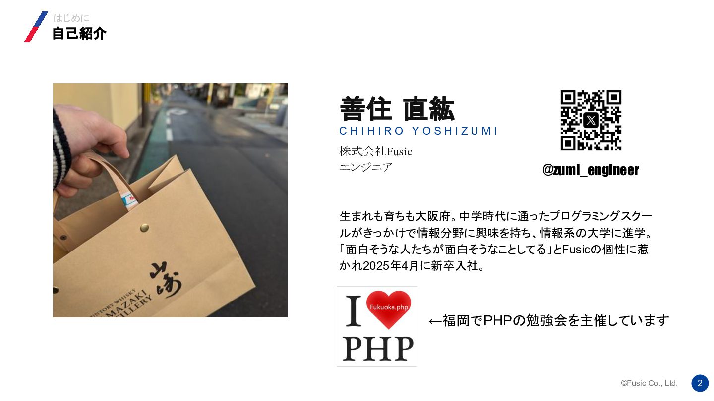 I R O Y O S H I Z U M I 株式会社Fusic エンジニア 生まれも育ちも大阪府。中学時代に通ったプログラミングスクー ルがきっかけで情報分野に興味を持ち、情報系の大学に進学。 「面白そうな人たちが面白そうなことしてる」とFusicの個性に惹 かれ2025年4月に新卒入社。 自己紹介 はじめに @zumi_engineer ←福岡でPHPの勉強会を主催しています