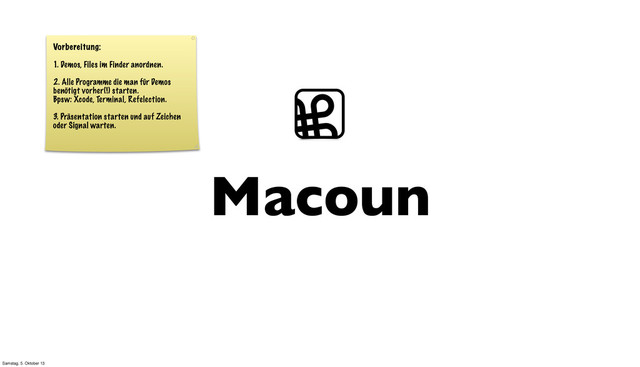 Macoun ⌘ Vorbereitung: 1. Demos, Files im Finder anordnen. 2.