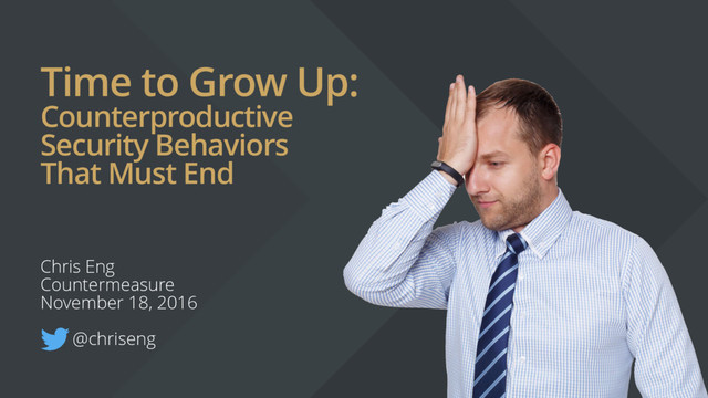 You’ve heard it all before: “The security industry has failed.” “Developers just don’t care.” “They deserved to be breached.” These and many other overused themes are promulgated by security practitioners at conferences, in social media, and worst of all, in their day jobs. Security practitioners, particularly those new to the industry, regurgitate the same counterproductive ideas and behaviors to the extent they have become clichés. This ultimately damages our collective credibility and creates unnecessary barriers to what we are trying to accomplish. We often lack empathy and pragmatism, reverting to stereotypical one-dimensional attitudes rather than focusing on the positive outcomes we are trying to achieve. We are, at times, caricatures of ourselves. In this presentation, we will take a light-hearted look at many of these problematic themes and discuss how we as security professionals can do better.